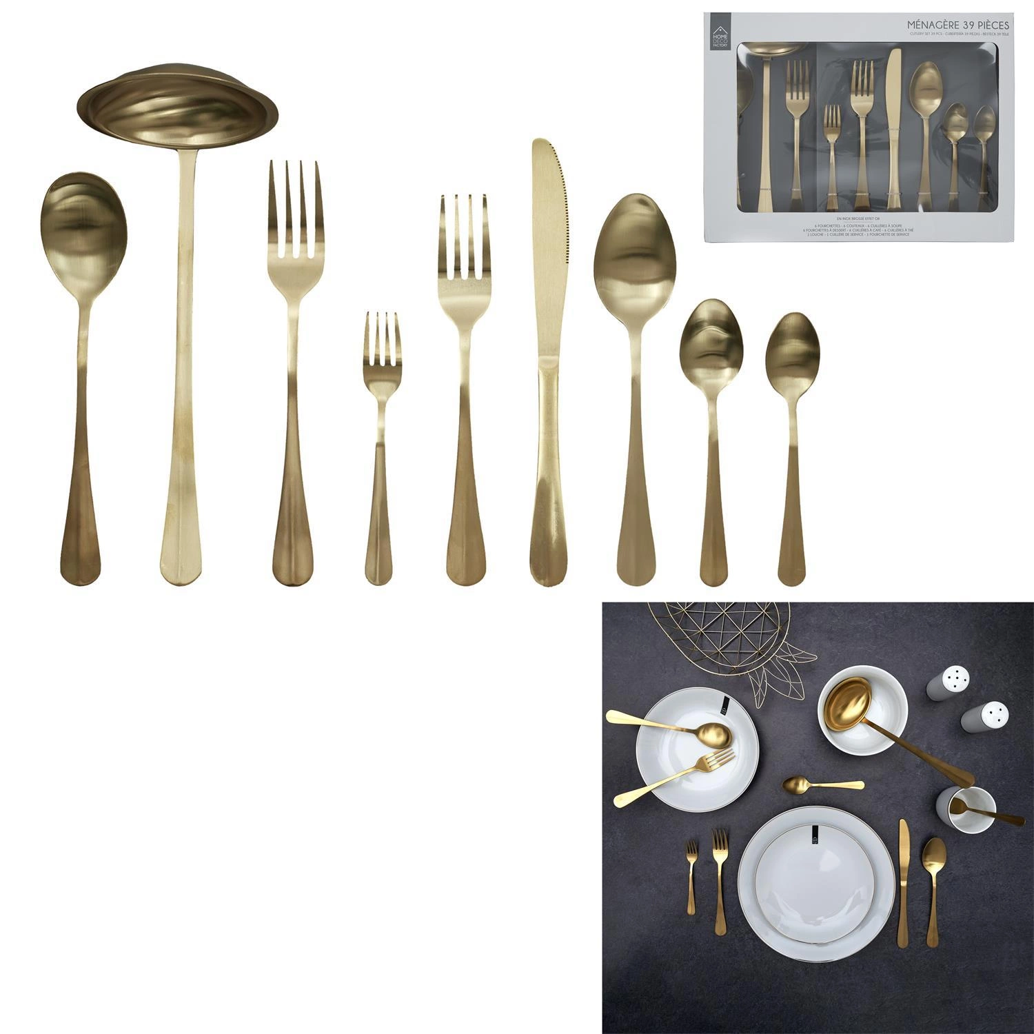 Sada jídelních příborů Intesi ve zlaté barvě je ideální volbou pro ty, kteří ocení moderní styl a eleganci na každém stole. Komplet obsahuje celkem 39 kusů, což umožňuje pohodlné servírování jídel až pro 6 osob. Příbory jsou vyrobeny z kvalitní nerezové oceli, díky čemuž vynikají dlouhou životností, odolností proti poškrábání a snadnou údržbou – bez obav je můžete mýt v myčce nádobí.