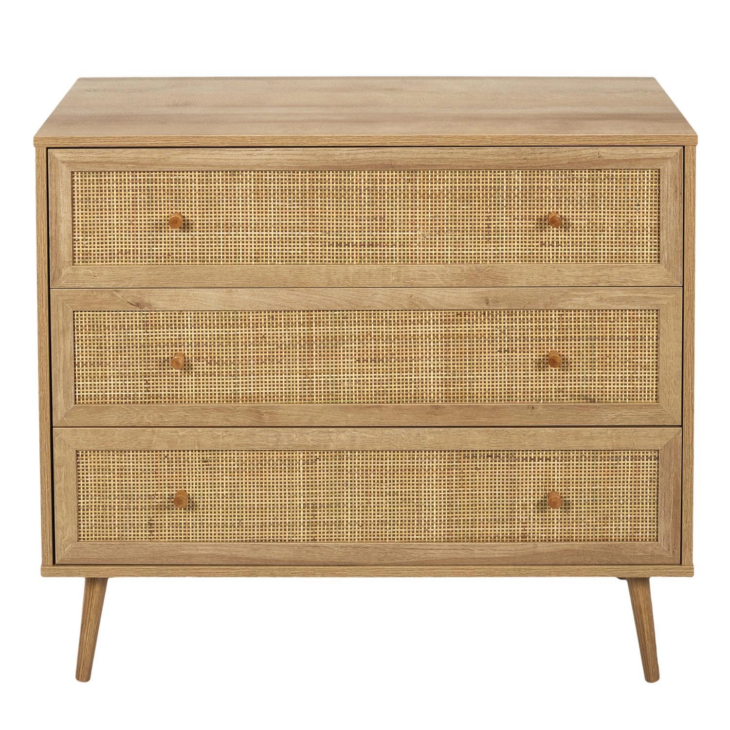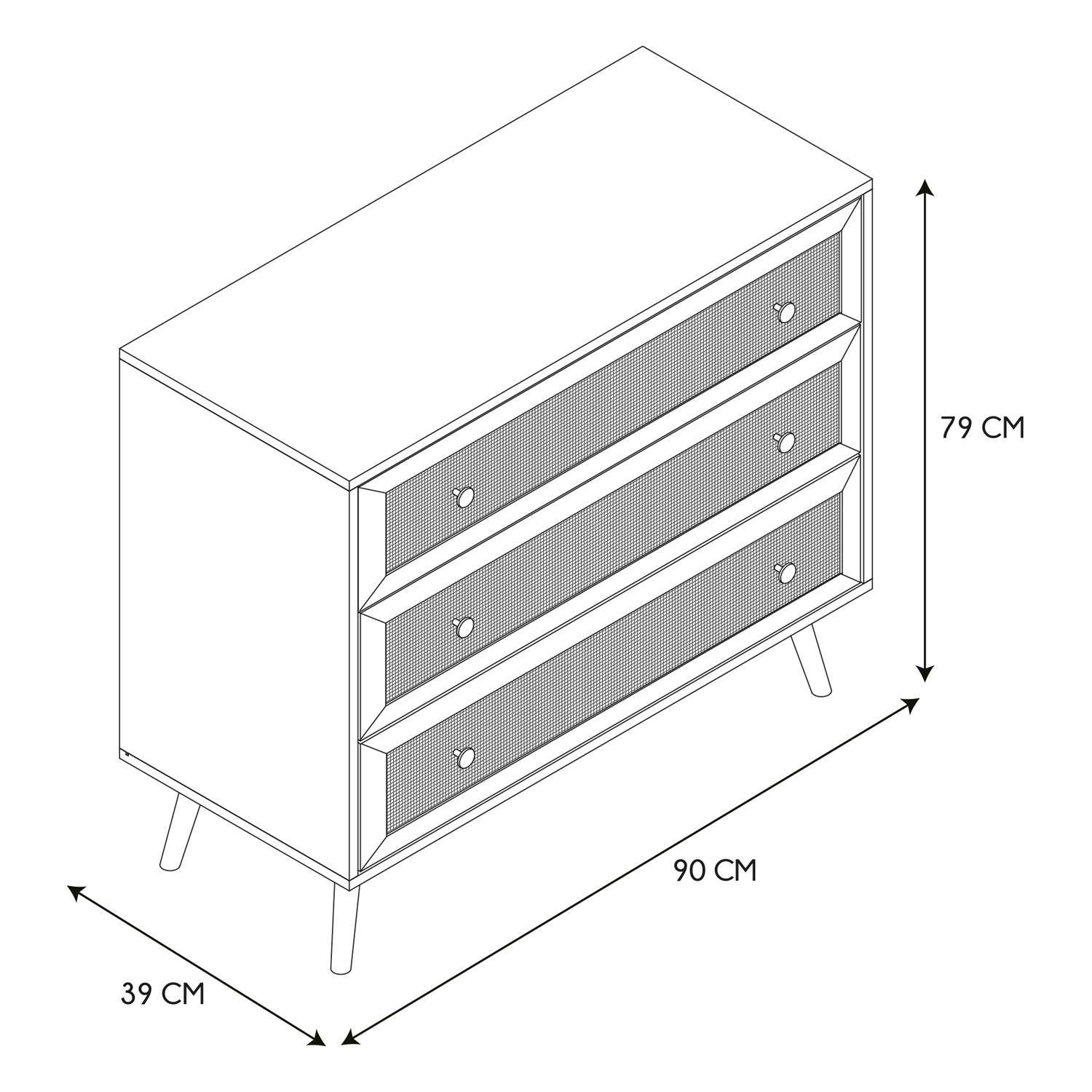 Komoda Bali boho od značky Intesi je jedinečný kus nábytku o šířce 90 cm, který spojuje přírodní hnědou barvu s charakteristickým pleteným čelem a třemi prostornými zásuvkami. Vyrobena z odolné laminované desky, stojí na čtyřech štíhlých nohách, díky čemuž působí lehce a stylově. Tato moderní komoda do obýváku nebo ložnice vnese do vašeho interiéru atmosféru pohody a útulnosti inspirovanou boho stylem.