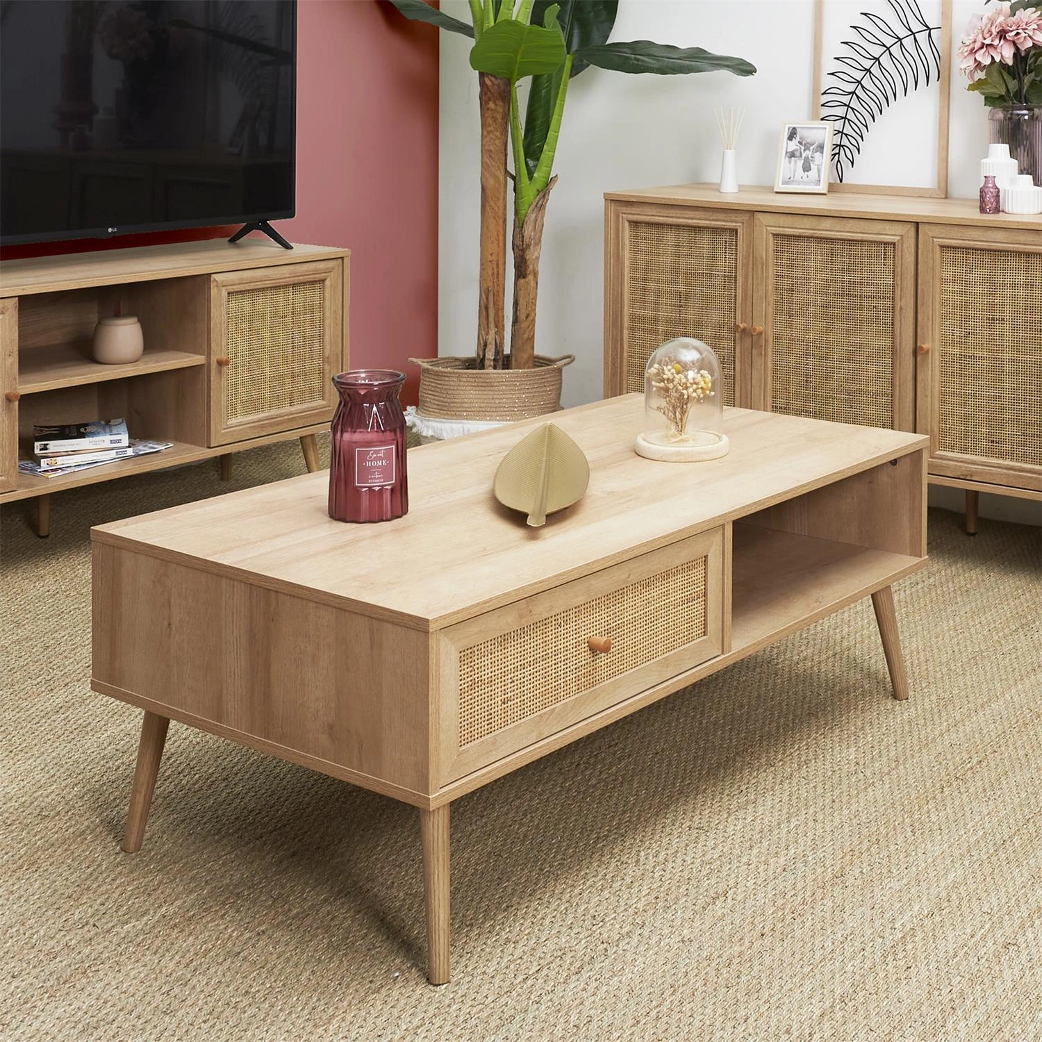 Konferenční stolek Bali obdélníkový dřevěný s ratanovou zásuvkou boho do obýváku Intesi – přírodní prvek ve vašem obývacím pokoji