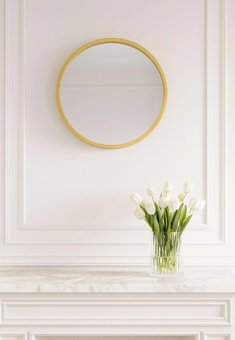 Kulaté zrcadlo o průměru 30 cm ve zlatém rámu se skvěle hodí do předsíně, kde zavěšené nad komodou nebo konzolou bude elegantně vítat vaše návštěvy. Afiya je také velké zrcadlo na toaletní stolek, kterému při ranních přípravách neunikne jediný detail. Zrcadlo se silným dřevěným rámem natřeným zlatou barvou má háčky na zavěšení. Rám o tloušťce až 2,5 cm dodává kontrastu a výrazu loftu. Afiya je k dispozici na ve dvou barevných provedeních a několika velikostech , které mohou vytvořit okouzlující soupravu
