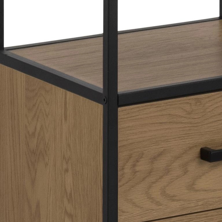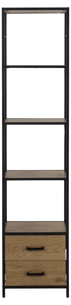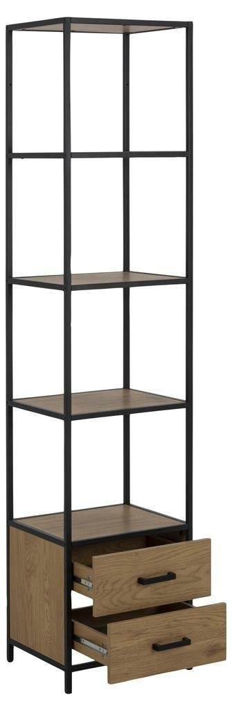 Sloupová knihovna Seaford představuje způsob, jak zajistit praktický úložný prostor. Stane se dalším prostorem pro knihy, fotografie a domácí zeleň. Jeho rám je vyroben z práškově lakovaného kovu v černé barvě. Má čtyři police z MDF v dubové dýze a dvě hluboké zásuvky ze stejného materiálu. Zásuvky mají jednoduché kovové úchytky v černé barvě. Podstavec stojí na čtyřech stabilních nohách. Knihovna Seaford je model, který se hodí do každé místnosti. Své místo najde jak v industriálním obývacím pokoji, tak v moderním pokoji teenagera. S hloubkou 35 cm se bude skvěle vyjímat i v předsíni nebo čekárně.