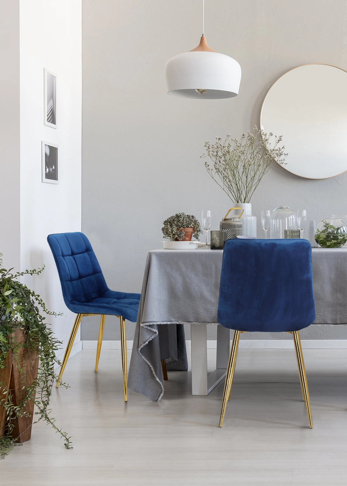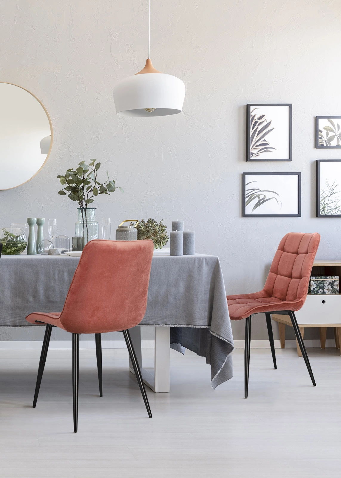 Každý z nás má doma místo, které je pro něj obzvlášť důležité. Touha pečovat o tento prostor, který je pro nás výjimečný, nás vede k rozhodnutí vybrat originální nábytek pro jedinečnou prezentaci. Čalouněné sametové křeslo PLAID vám pomůže zařídit prostor tak, abyste se v něm cítili výjimečně a příjemně. Čalouněný prošívaný sedák židle je velmi pohodlný díky tvarovanému opěradlu. Látka se sametovým povrchem způsobuje, že se na ní sedí jako na pověstném obláčku, protože svou měkkostí a jemností lahodí našemu hmatu. Židle nemá područky, takže ji lze zasunout pod jakýkoli stůl, čímž se ušetří místo. Proto bude židle PLAID skvělou volbou jako konferenční židle nebo jídelní židle k malému stolu. Kovové nohy s černým práškovým nástřikem jsou odolné proti poškození. Polomatná povrchová úprava nohou působí velmi elegantně a dodává nábytku moderní nádech. Nohy židle jsou opatřeny plastovými nožičkami, které chrání podlahu před poškrábáním