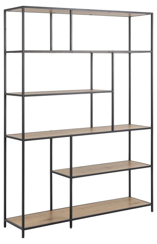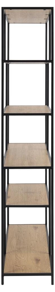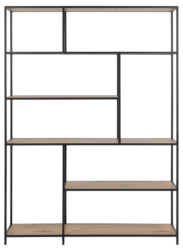 Regał na knihy Seaford XIV od značky Actona je industriální kovový regál o působivé šířce 135 cm a výšce 185 cm, vybavený 6 prostornými policemi s přirozeným dekorem v barvě dubu. Pevná, černá kovová konstrukce spolu s policemi z odolné desky potažené dýhou imitující dřevo dělají z tohoto regálu nejen praktický, ale i stylový kus nábytku do obývacího pokoje, kanceláře nebo pracovny. Skvěle zapadne do moderních loftových interiérů a umožní vystavit sbírku knih, dekorací nebo rostlin.