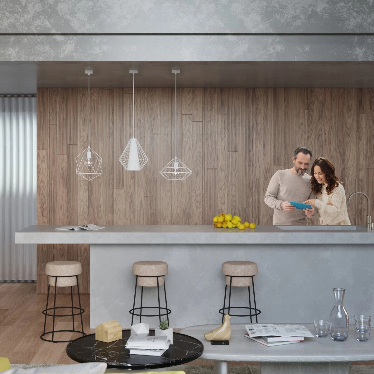 - Jednoduché závěsné svítidlo – ideální nad stůl, ostrůvek nebo jako bodové osvětlení vybrané zóny