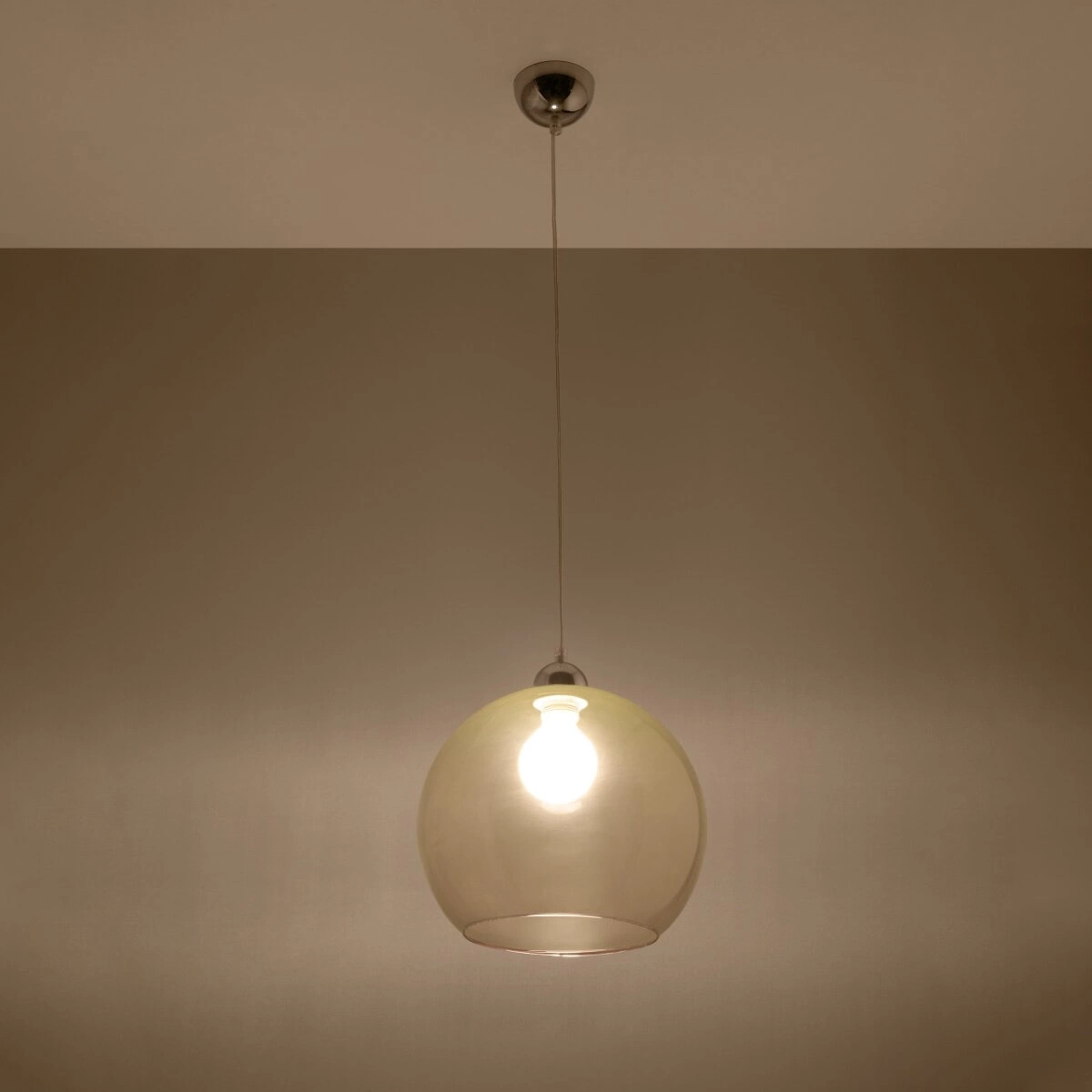 Závěsná lampa koule BALL přináší do prostoru teplé, rozptýlené světlo, které podtrhne atmosféru relaxační zóny nebo jídelny. Její minimalistický kulovitý tvar nejen skvěle vynikne v moderních interiérech, ale také opticky zvětšuje místnost. Skleněné stínidlo v šampaňském odstínu jemně filtruje světlo a vytváří útulnou a jedinečnou atmosféru při rodinných večeřích i setkáních s přáteli.