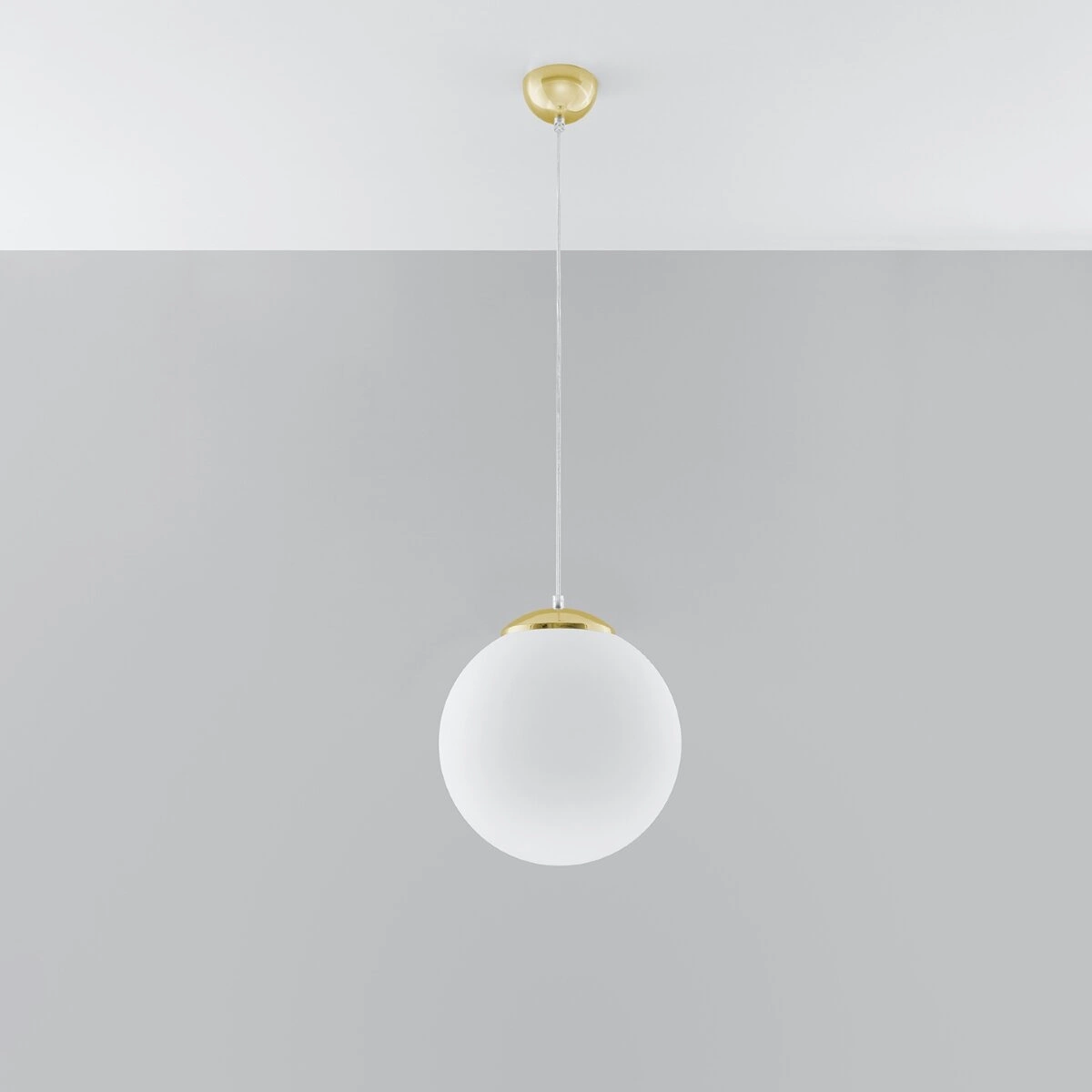 Závěsné svítidlo koule UGO 30 od značky Sollux Lighting je moderní stropní osvětlení, které spojuje jemnost mléčně bílého skla s elegantním zlatým detailem. Model o průměru 30 cm a maximální výšce 120 cm je ideální jako závěsná lampa nad stůl, do obývacího pokoje, kuchyně nebo jídelny. Jednoduchá objímka E27 umožňuje volný výběr žárovky – od klasické až po LED – a díky tomu snadno vytvoříte optimální atmosféru v interiéru.