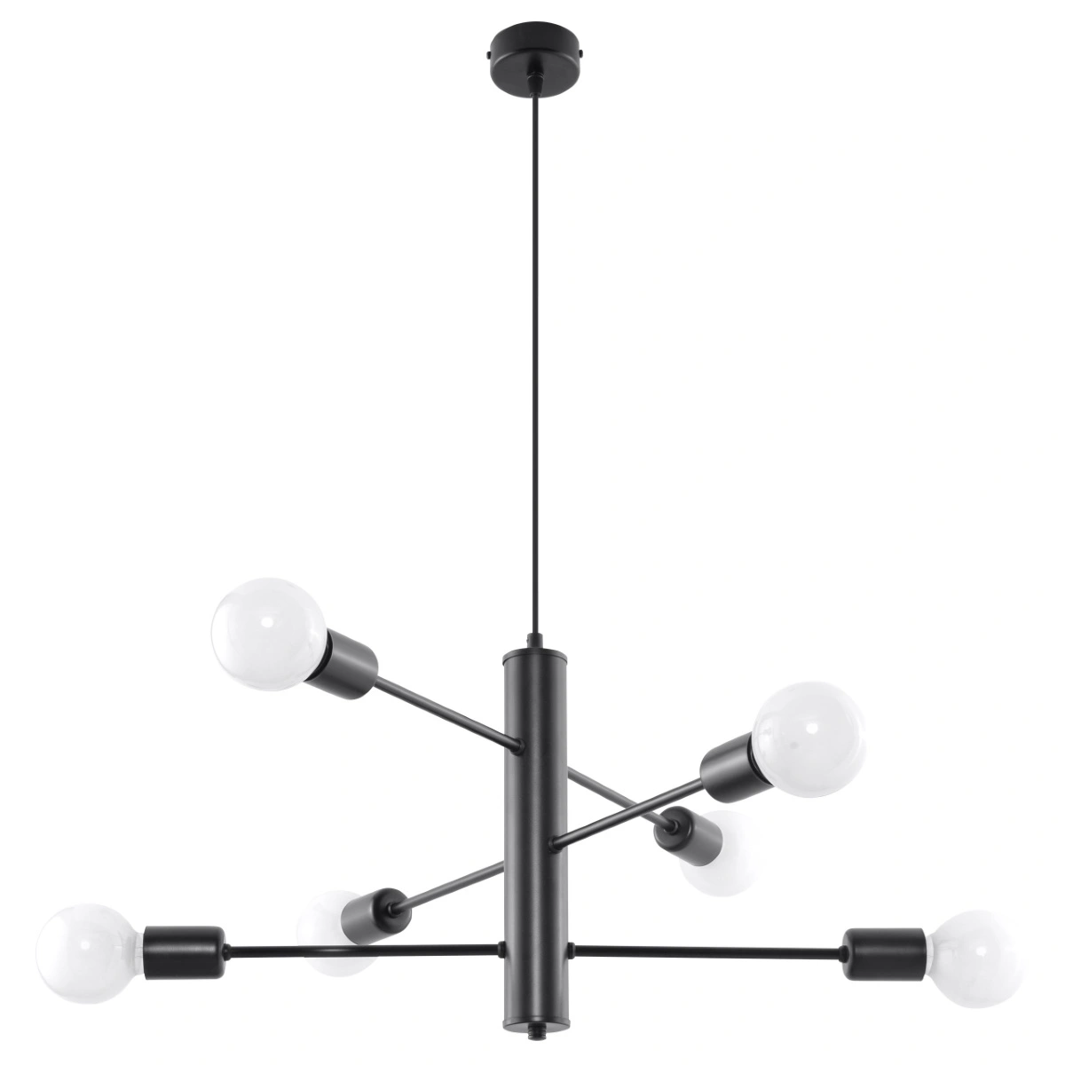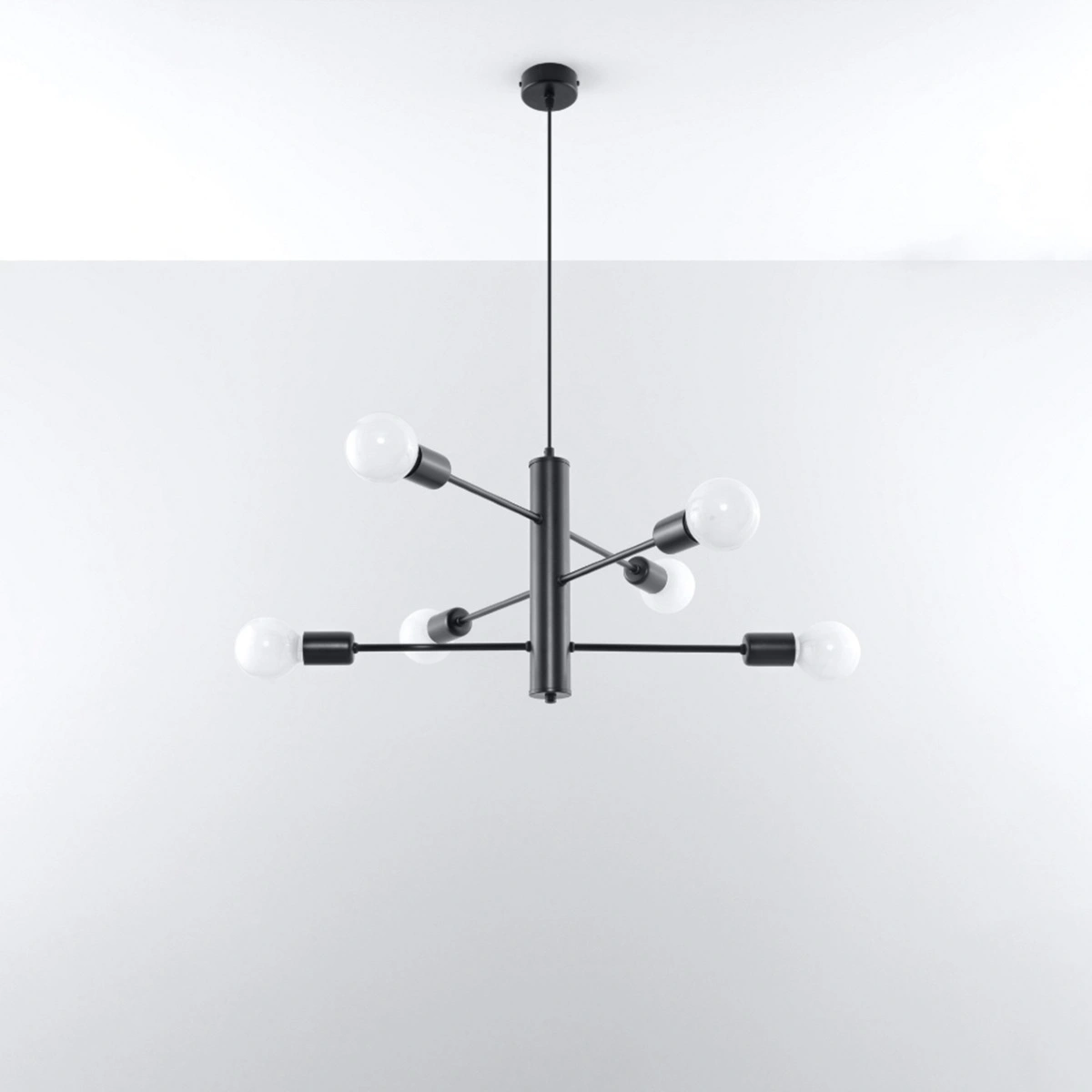 DUOMO 6 je lustr do obývacího pokoje či jídelny, který upoutá pozornost svou strohou, geometrickou siluetou. Kovová konstrukce v černé barvě skvěle zapadne do moderních i industriálních prostor, kde vytváří harmonické pozadí pro stylové doplňky. Otevřená ramena svítidla zvýrazňují žárovky, což umožňuje vytvořit jedinečnou atmosféru – od útulného světla v ložnici až po výrazné osvětlení nad jídelním stolem.