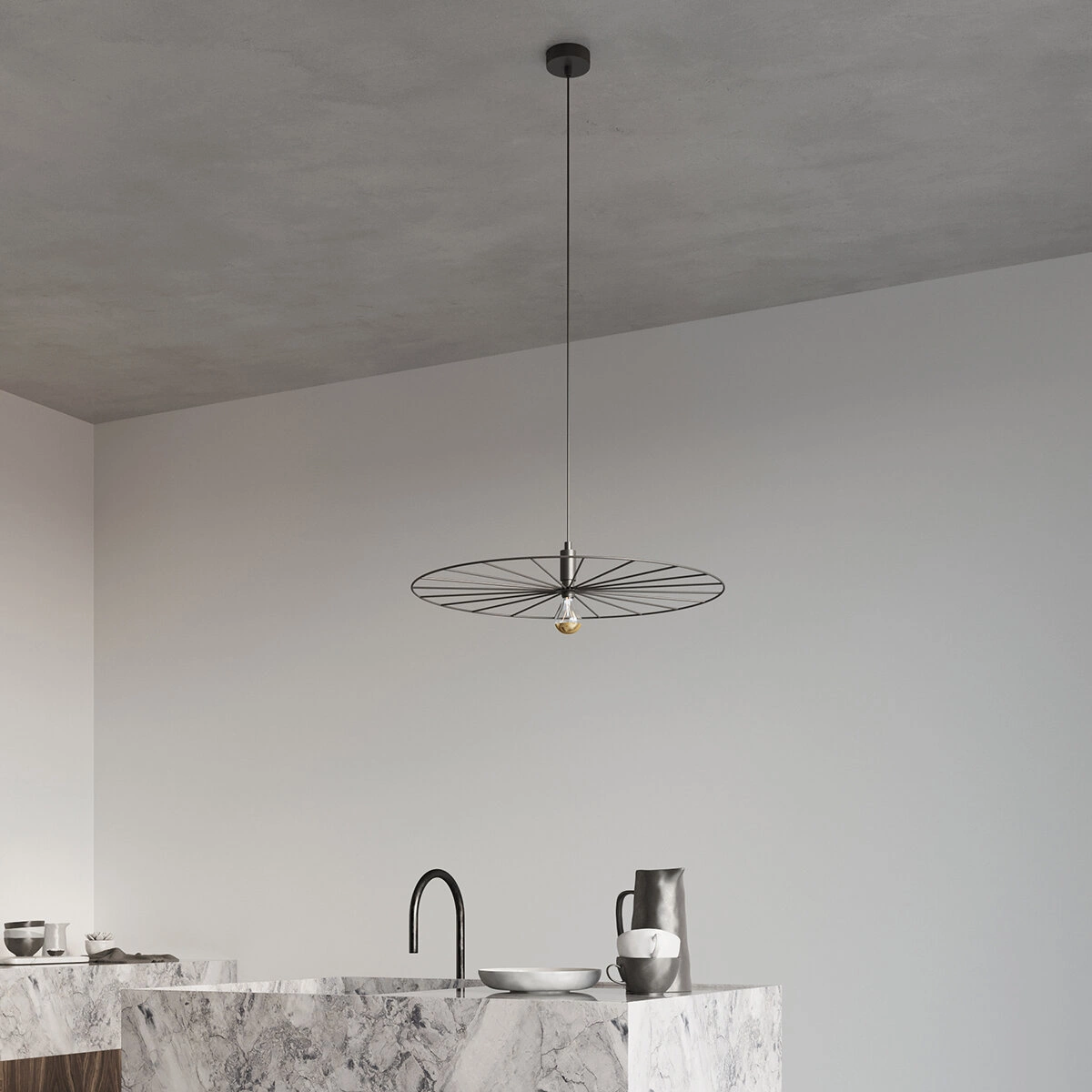 Závěsná lampa Sirkel 30 černá je působivým spojením jednoduchých linií a syrového kovu, které skvěle zapadne do moderních, industriálních nebo loftových interiérů. Kulatý, vzdušný stínidlo z tenkých kovových prutů nenarušuje prostor, ale naopak jej podtrhuje a umožňuje světlu volně prostupovat celou místností. Díky výrazné černé barvě se stává dominantním prvkem jak ve světlých, tak tmavších interiérech a vytváří jedinečnou atmosféru nad jídelním stolem, kuchyňským ostrůvkem či v obývacím pokoji.