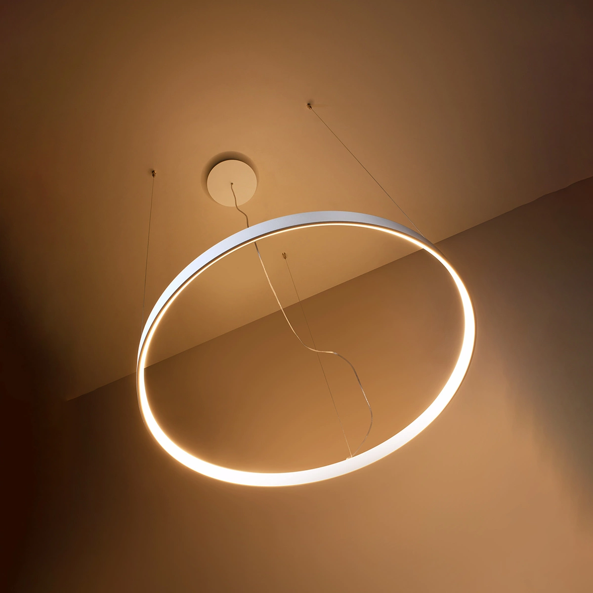 Moderní LED technologie použita v lustru RIO 110 zajišťuje rovnoměrné a rozptýlené osvětlení s okamžitým startem. Teplá barva světla (3000K) podporuje relaxaci a vytváří útulnou atmosféru, což z tohoto modelu dělá skvělou volbu jako lustr do obývacího pokoje nebo závěsné svítidlo nad stůl. Výšku až do 150 cm lze snadno přizpůsobit charakteru a rozměrům interiéru, což je zvlášť praktické ve vysokých loftech, prostorných jídelnách nebo na schodištích.