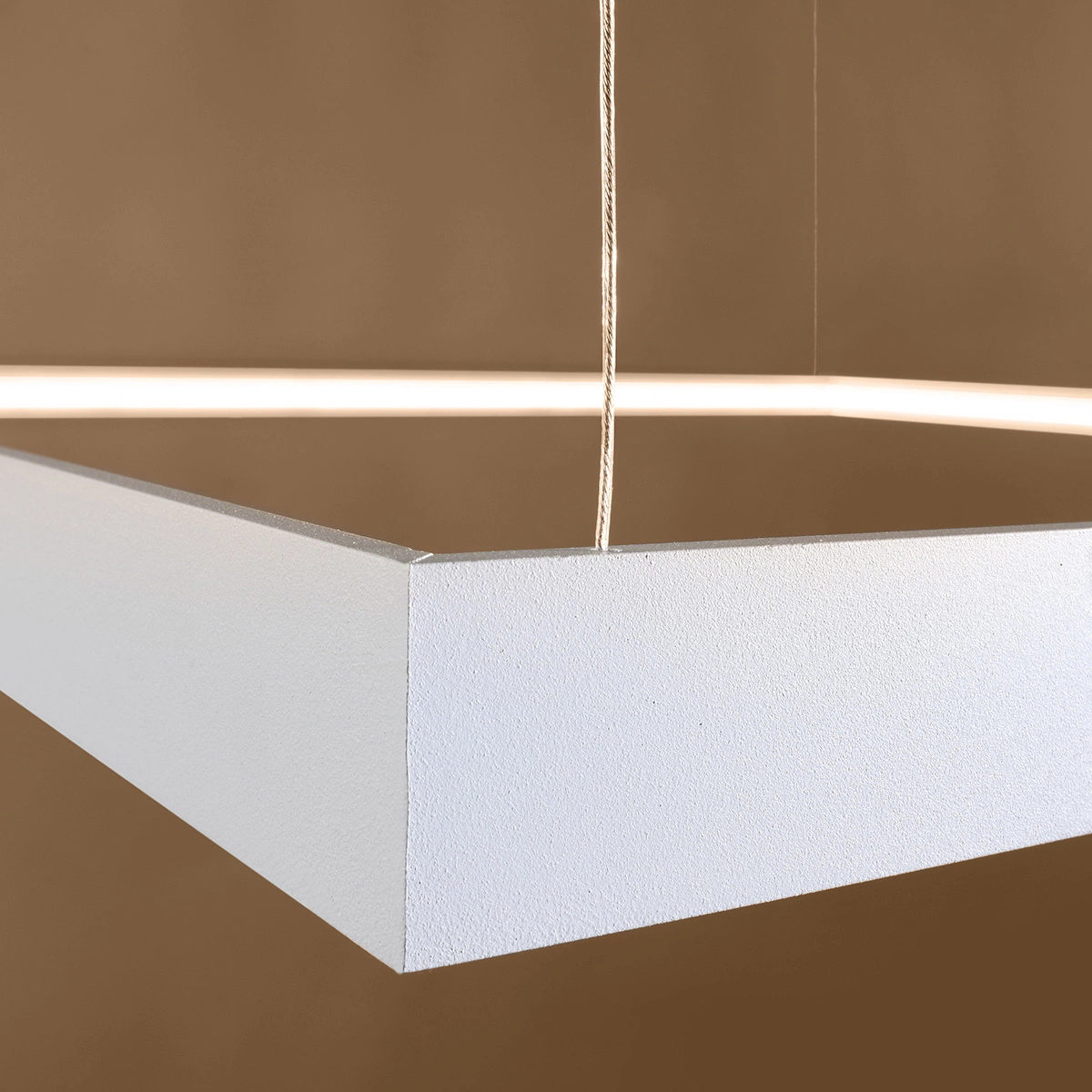 LED lustr Nelya M zaujme geometrickou, vzdušnou konstrukcí, která perfektně ladí s industriálním i moderním stylem bydlení. Bílý kovový povrch podtrhuje elegantní vzhled svítidla a zároveň zajišťuje snadnou údržbu. Tvar založený na čtverci o rozměrech 80×80 cm umožňuje rovnoměrné rozptýlení světla po celé místnosti a vytváří příjemnou atmosféru jak při každodenním odpočinku, tak při setkáních s rodinou a přáteli.