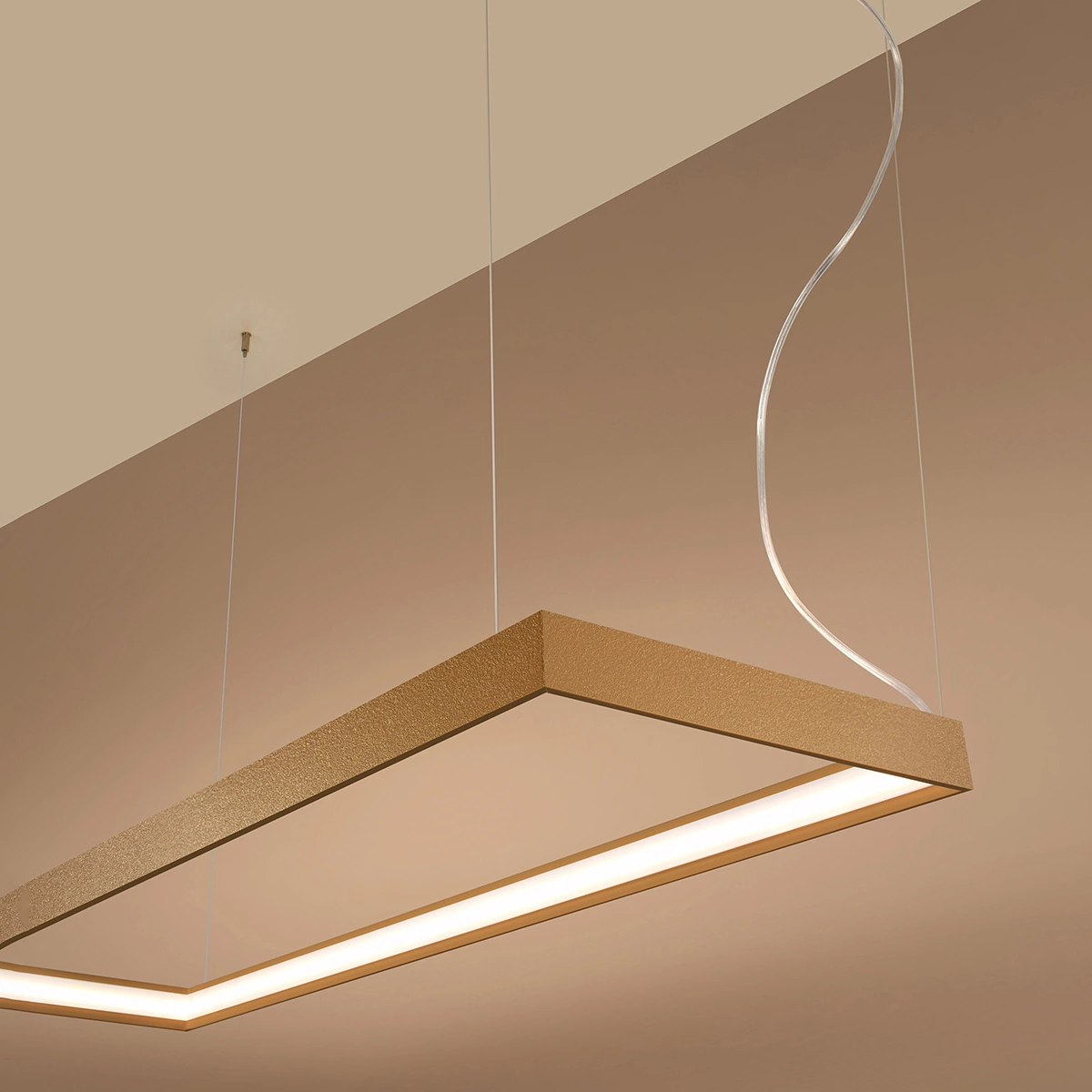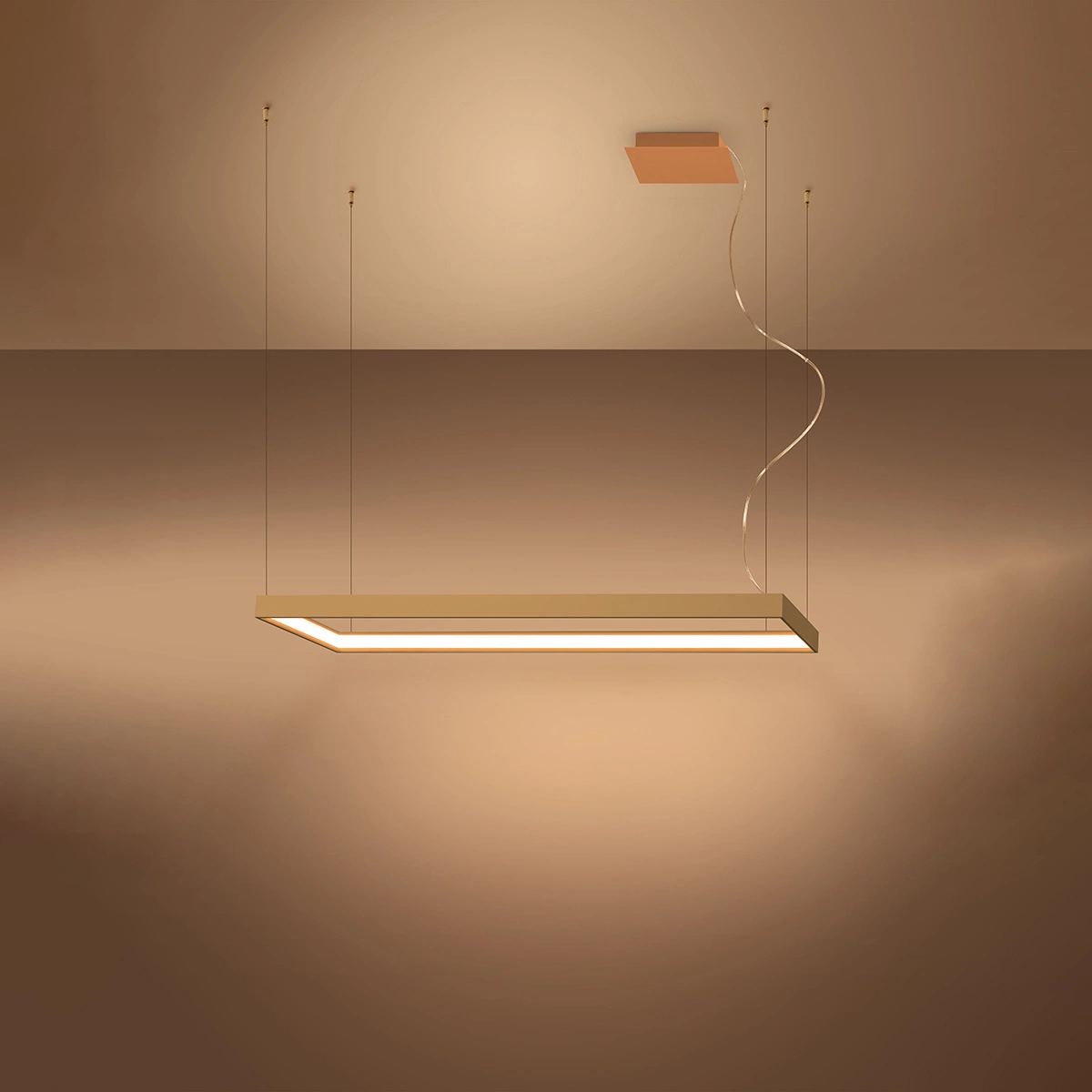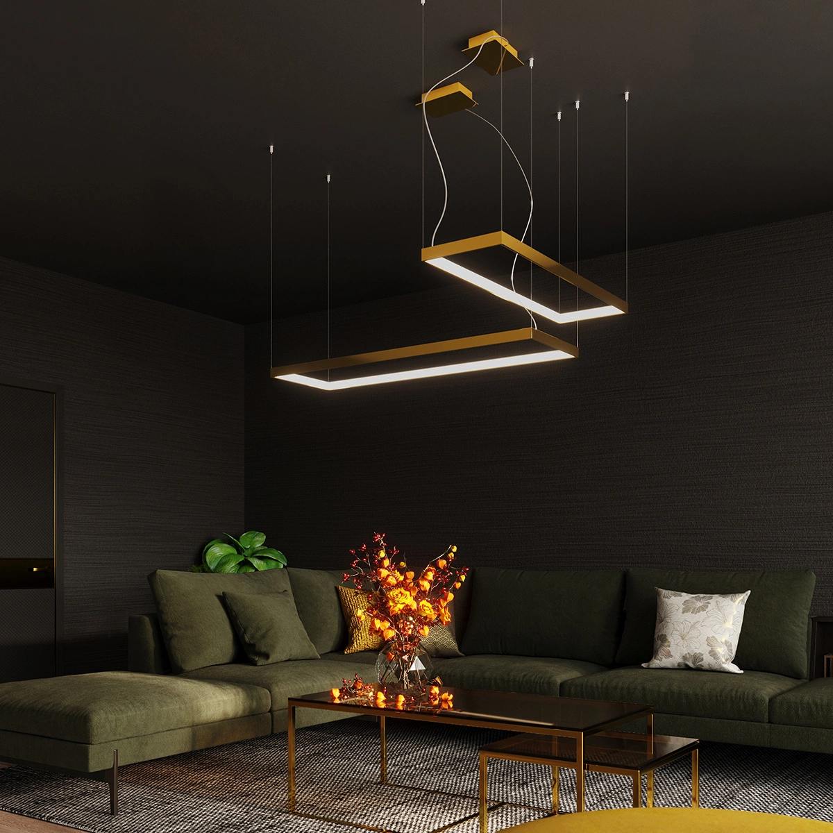 LED lustr Tuula M značky Thoro je výrazný, moderní světelný prvek, který spojuje zlatou barvu, industriální design a úsporný LED zdroj o výkonu 50W. Minimalistický, geometrický tvar o délce 150 cm a šířce 30 cm je vyrobený z odolného hliníku, takže je ideální jako hlavní stropní svítidlo do obývacího pokoje, jídelny nebo nad stůl do kuchyně. V sadě najdete energeticky úsporné LED osvětlení s teplou barvou světla 3000K.