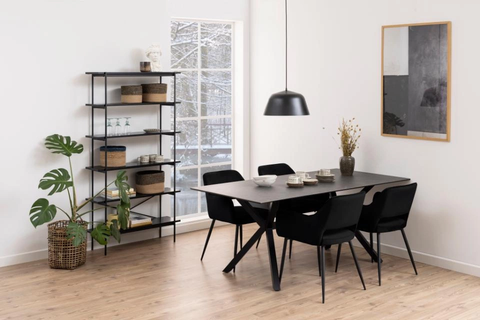 Kombinace matné černé a minimalistického provedení dělá z této židle perfektní volbu pro moderní i industriální interiéry. Stabilní kovová základna zajišťuje pevnost a dlouhou životnost, díky čemuž je model Ranja vhodný nejen do domácnosti, ale i do komerčních prostor – restaurací, banketových sálů nebo konferenčních místností. Výška područek 63,5 cm umožňuje pohodlně zasunout židli pod většinu stolů a zároveň poskytuje dostatek volnosti pohybu.