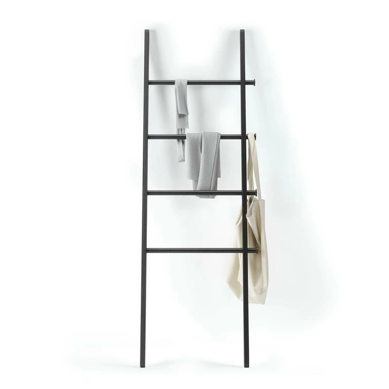 Leana Umbra je mnohem víc než klasický věšák do předsíně. Díky tvaru žebříku skvěle poslouží jako stojací věšák na ručníky v koupelně nebo jako designový stojan na oblečení v ložnici či šatně. Čtyři široké, horizontální příčky umožňují přehledné zavěšení více kusů oblečení, zatímco praktické boční háčky nabízejí další prostor na doplňky – například fén, kabelky nebo klíče.