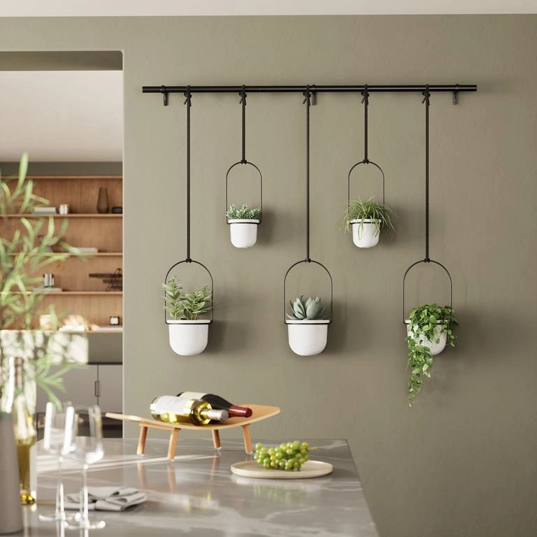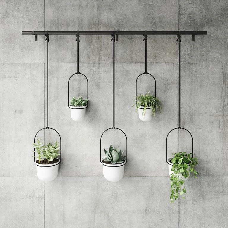 Sada obsahuje pět lehkých, a přitom pevných květináčů (dva o průměru 12,4 cm a tři o průměru 17,7 cm), což umožňuje experimentovat s různými druhy rostlin. Konstrukce je založena na robustní kovové liště, která zajišťuje stabilitu a snadnou montáž na stěnu nebo nad okno. Jde o ideální květináč na bylinky do kuchyně, ale skvěle se uplatní i jako závěsný květináč na balkon nebo do domácí pracovny. Díky univerzálním barvám (bílá a černá) se hodí k většině interiérů.