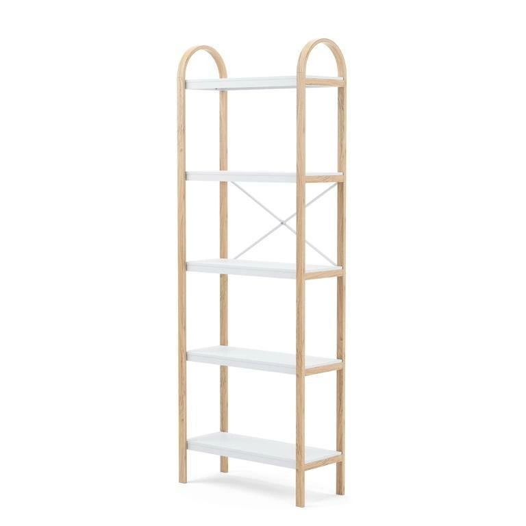 Knihovna Bellwood od značky Umbra je výjimečný kus nábytku v severském stylu, který spojuje přírodní odstíny dřeva s matnou bílou barvou. Díky pěti prostorným policím o hloubce 26 cm a výšce 170 cm nabízí regál pohodlné místo pro uložení knih, dekorací nebo květin. Stabilní, zaoblená konstrukce a jemné detaily z něj dělají nejen praktický, ale i výrazný prvek do obývacího pokoje, ložnice či domácí kanceláře.