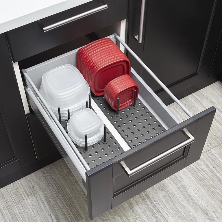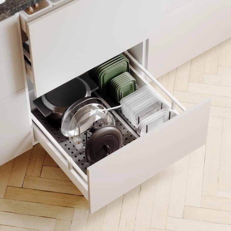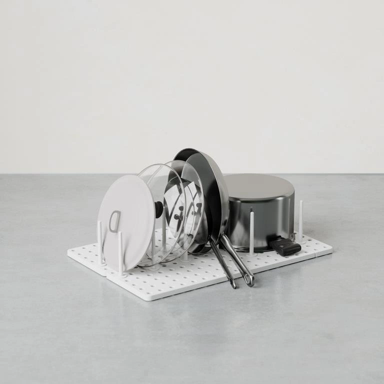 Stojan Peggy je skvělým doplňkem, který vám pomůže uspořádat kuchyň. Umožňuje rovnoměrné umístění hrnců, pánví nebo nádobí v zásuvce. Nasaďte si Peggy a zapomeňte na nepořádek v kuchyňských skříňkách! Stojan má výsuvný prvek, takže si můžete nastavit jeho délku. K dispozici v černé a bílé barvě.