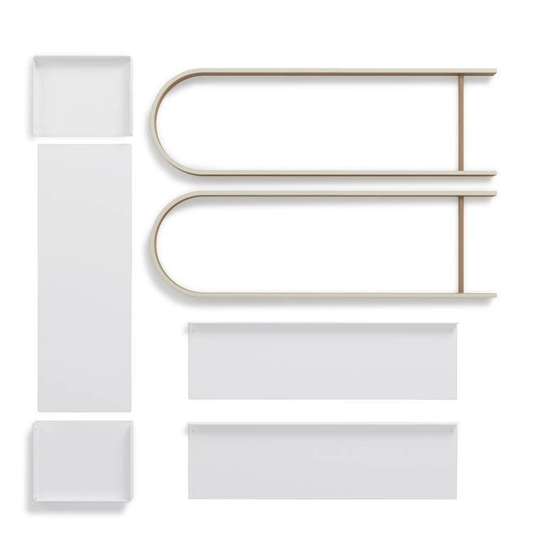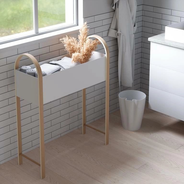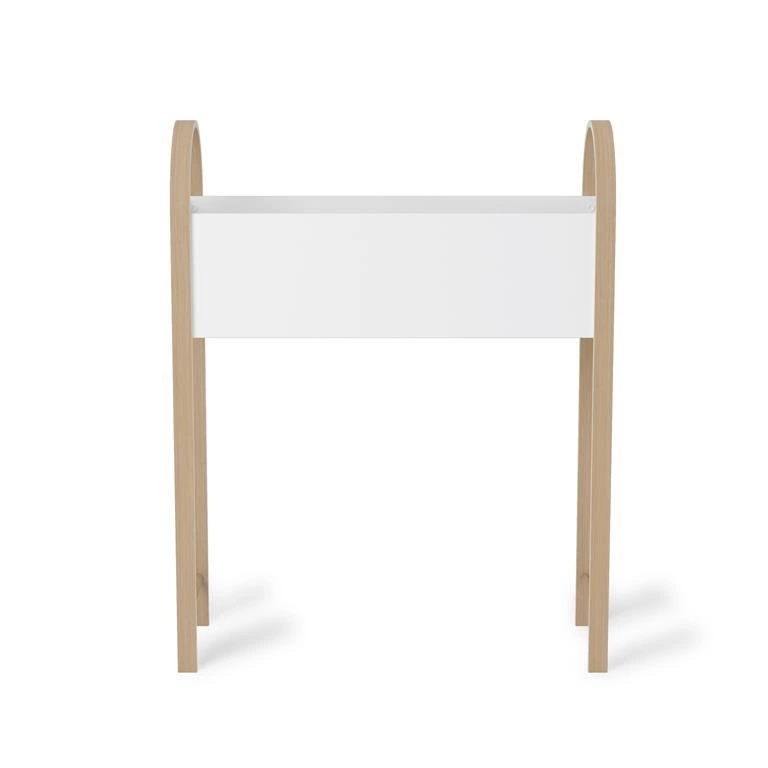 Celá souprava je udržována v tlumených barvách. Bílá skříňka je vyrobena z odolné desky, zatímco základnu tvoří dvě dřevěné nohy s charakteristicky zaoblenou horní částí. Univerzální kus nábytku se hodí do každého interiéru a stane se jeho ozdobou.