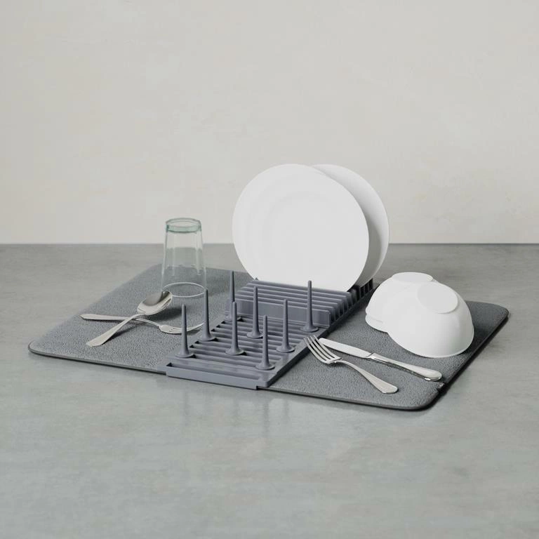 Šedá odkapávací podložka na nádobí Umbra UDRY skvěle zapadne do moderních interiérů a spojuje elegantní vzhled s praktičností. Mikrovlákno účinně absorbuje vodu a chrání pracovní plochu před skvrnami a kapkami. Díky univerzální tlumené barvě a nenápadnému designu nenarušuje vzhled kuchyně a po skončení sušení ji snadno srolujete a uložíte do zásuvky nebo skříňky.