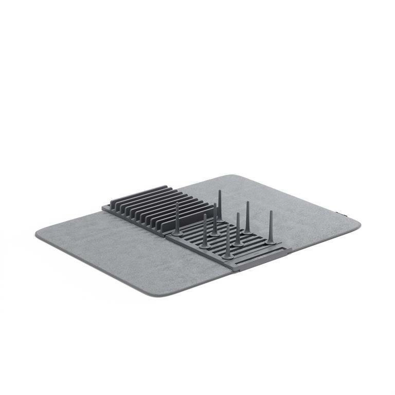 Podložka na sušení nádobí Umbra UDRY je vybavena odnímatelným plastovým odkapávačem, který bezpečně drží talíře, misky i sklenice. Mikrovláknová podložka zajišťuje rychlé odpařování vlhkosti a urychluje schnutí nádobí. Povrch podložky je měkký, a tak chrání křehké sklo a keramiku před poškrábáním. Výrobek je lehký a snadno se udržuje v čistotě – mikrovláknovou podložku lze prát v pračce, odkapávač jednoduše opláchnete pod tekoucí vodou.
