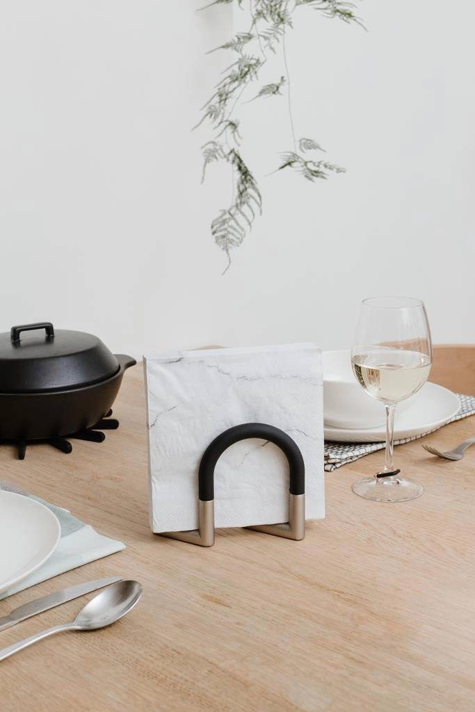 Swivel je design, který se hodí jak do domácnosti, tak do elegantní restaurace. Jedná se o stojan na ubrousky s mimořádně módním tvarem a chytrou funkčností. Jeho ramena se mohou rozšiřovat v závislosti na počtu ubrousků, což také zabraňuje tomu, aby jich při vytahování vypadlo příliš mnoho. Spodní část stojanu je vyrobena z kovu v barvě niklu, zatímco horní část je z černého plastu s hladkým povrchem. Otočný stojan na ubrousky je dokonalým společníkem pro každodenní život i pro bujaré večírky s přáteli.
