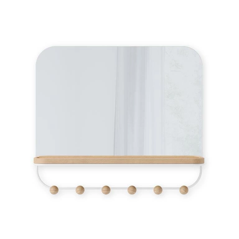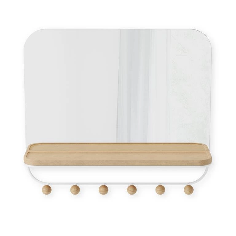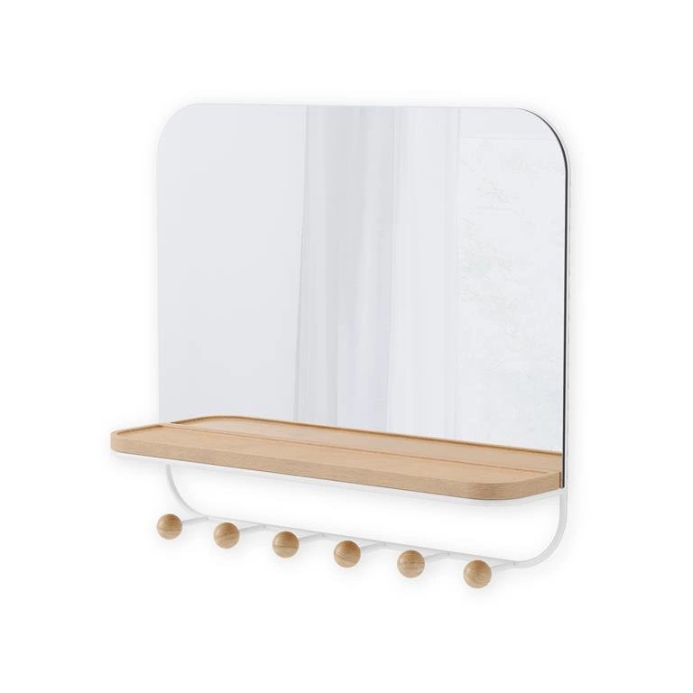 Zrcadlo Estique v kombinaci s policí a praktickými věšáky v podobě háčků je multifunkční konstrukce, která se skvěle hodí do vaší předsíně. Jelikož je připevněno na stěnu, ušetří spoustu místa i v malém bytě. Středně velké zrcadlo vám umožní podívat se na sebe, než opustíte byt, a přídavná polička poslouží jako místo na klíče, brýle a další předměty, které chcete mít vždy po ruce. Pod zrcadlem jsou navíc nainstalovány háčky, na které se úspěšně vejdou bundy, šály a klobouky. Zrcadlo Estique je zkrátka množství funkcí uzavřených v jednom výrobku a oděných do krásné estetické formy.