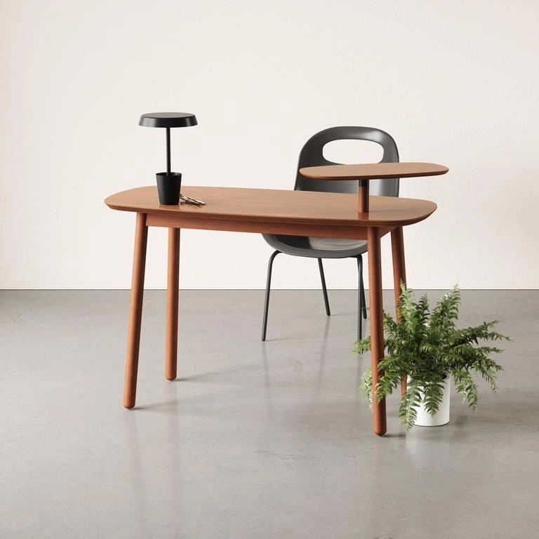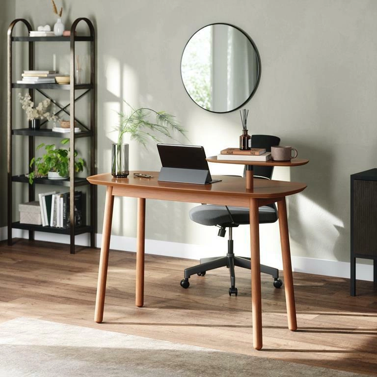Psací stůl Swivo je ideální volbou pro ty, kteří hledají pracovní stůl poskytující komfort i efektivní organizaci prostoru. Prostorná deska umožňuje pohodlně umístit notebook, dokumenty i kancelářské doplňky, zatímco otočná police ve výšce 90 cm nabízí další místo pro knihy, zápisníky nebo dekorace. Díky této inovativní funkci máte vše potřebné vždy po ruce a zároveň si snadno udržíte pořádek na pracovní ploše.