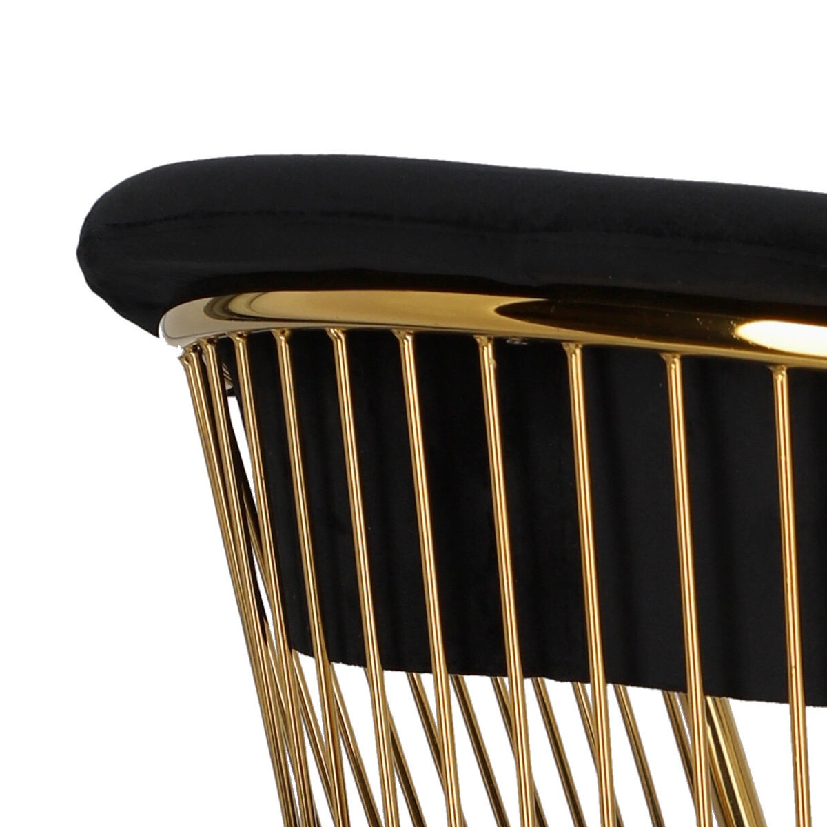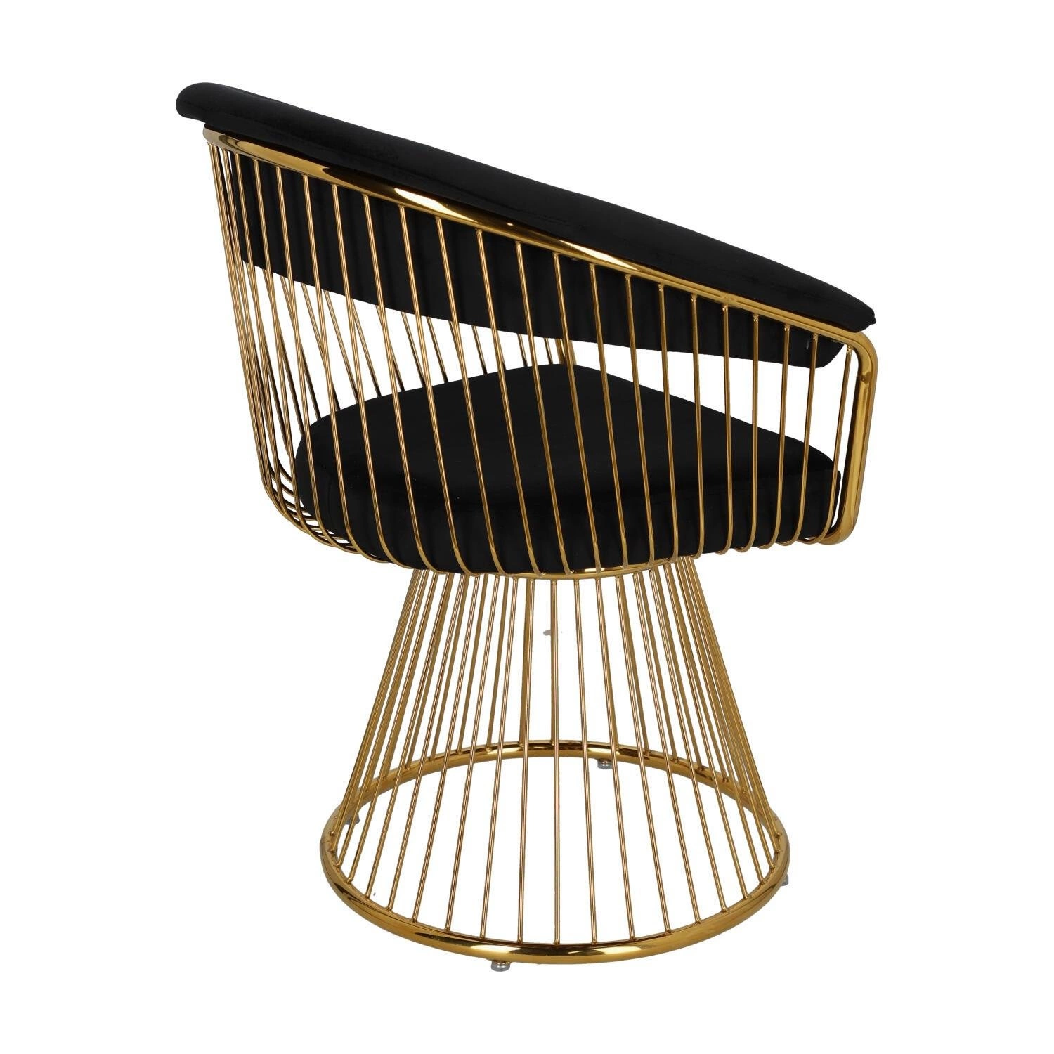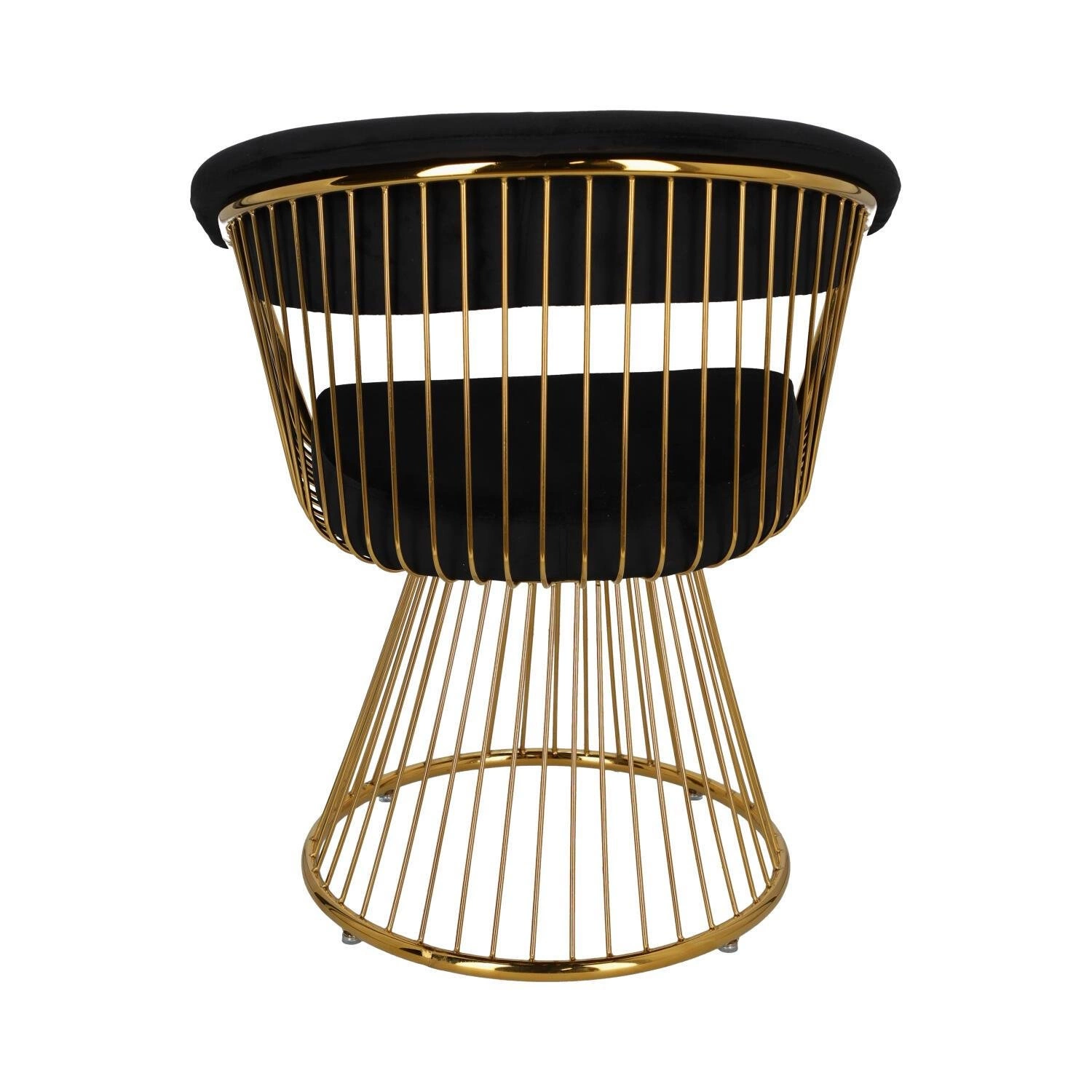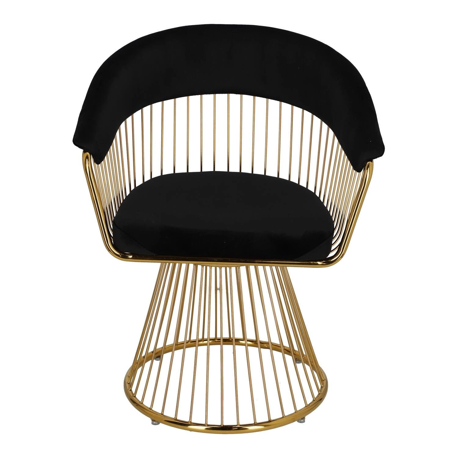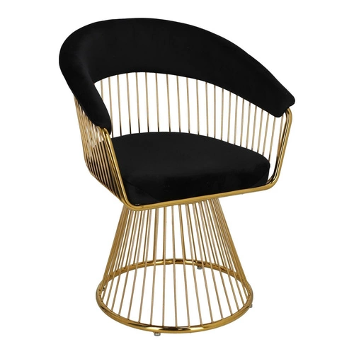 Extrémně okouzlující křeslo Feeny glamour je o koncentrovaném půvabu a luxusu. Toto křeslo s černým sametovým sedákem a opěradlem a krásnou zlatou kovovou podnoží udělá tečku za elegantním luxusním obývacím pokojem. Nebo snad hledáte originální židli k toaletnímu stolku? Křeslo Feeny se při líčení jistě osvědčí. Neobvyklou základnu židle tvoří kruh, z něhož směrem k sedadlu vystupuje množství zlatých konzol. Základna je chráněna průhlednými nožičkami, které zabraňují sklouznutí židle. Sedák, opěradlo a područky tvoří jakási skořepina, jejíž tvar je dán množstvím tvarovaných zlatých prutů. Na sedadle je 12 cm silný polštář čalouněný měkkou látkou. Opěradlo a područky jsou navíc čalouněné sametovou látkou, která je příjemná na dotek. Židle nevyžaduje montáž