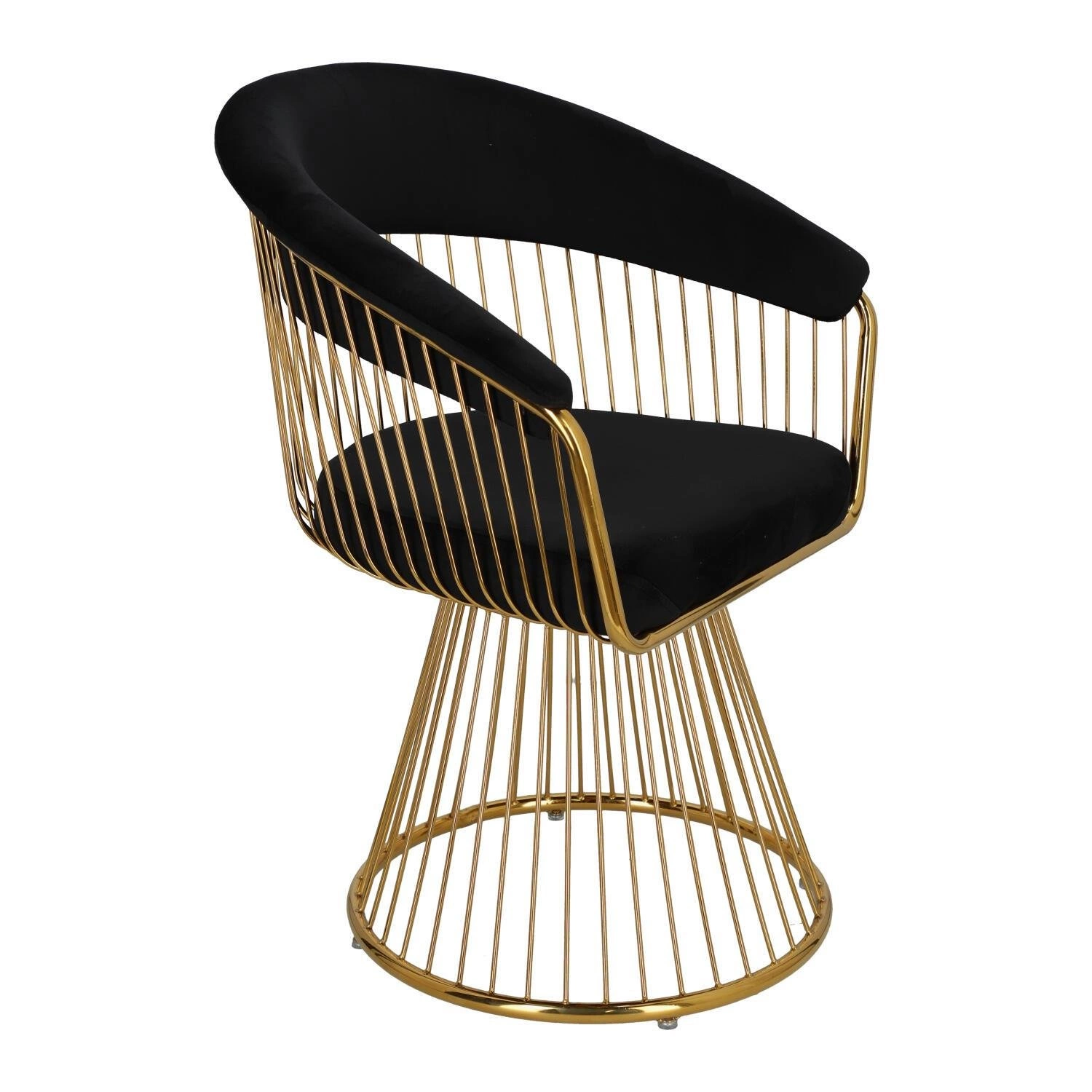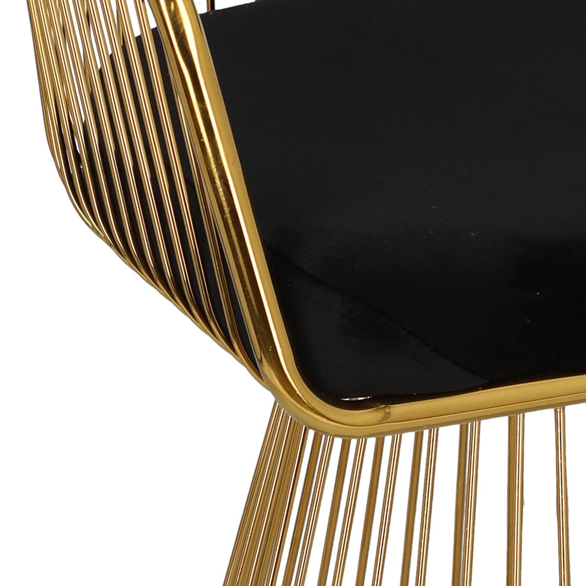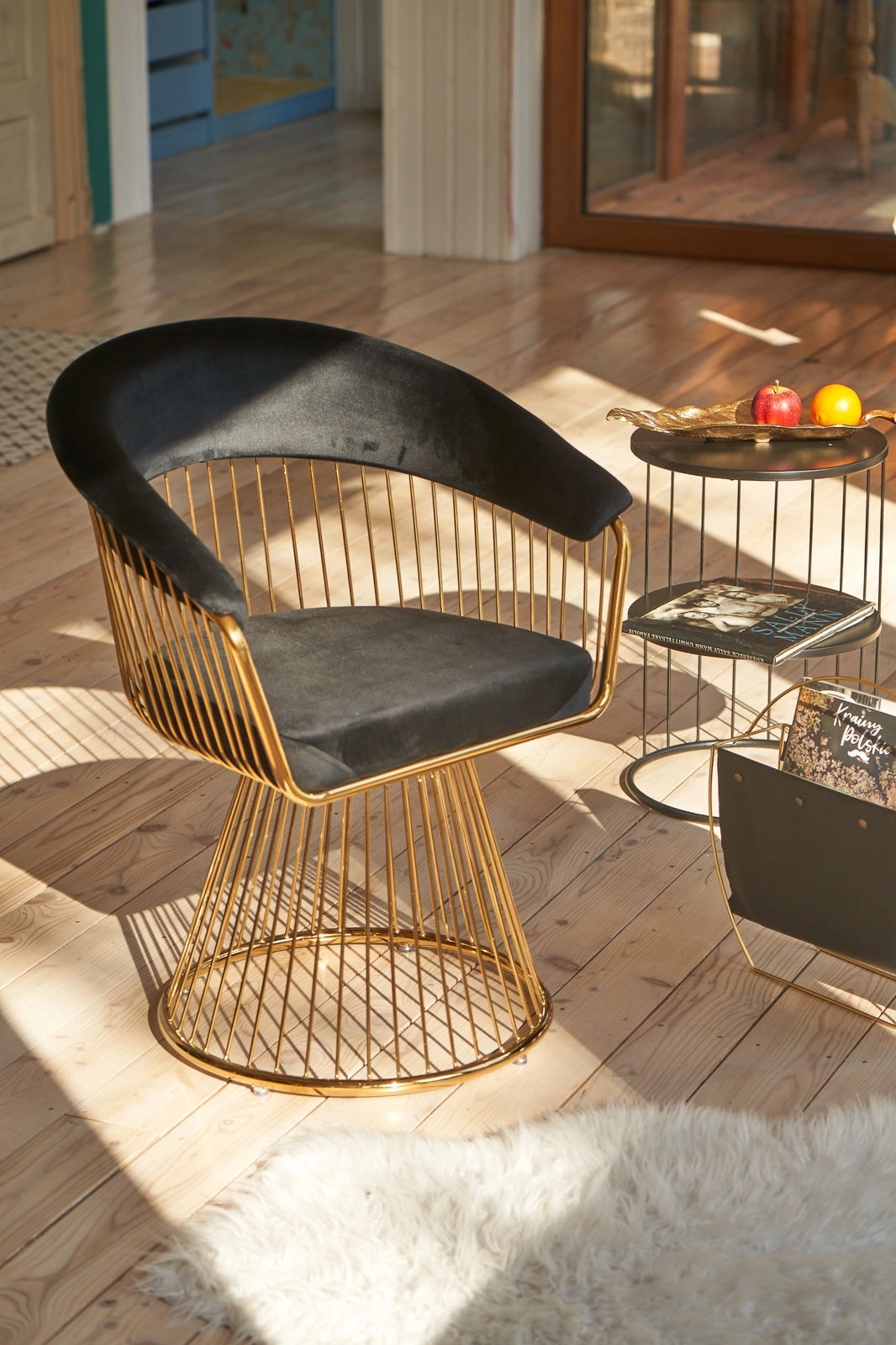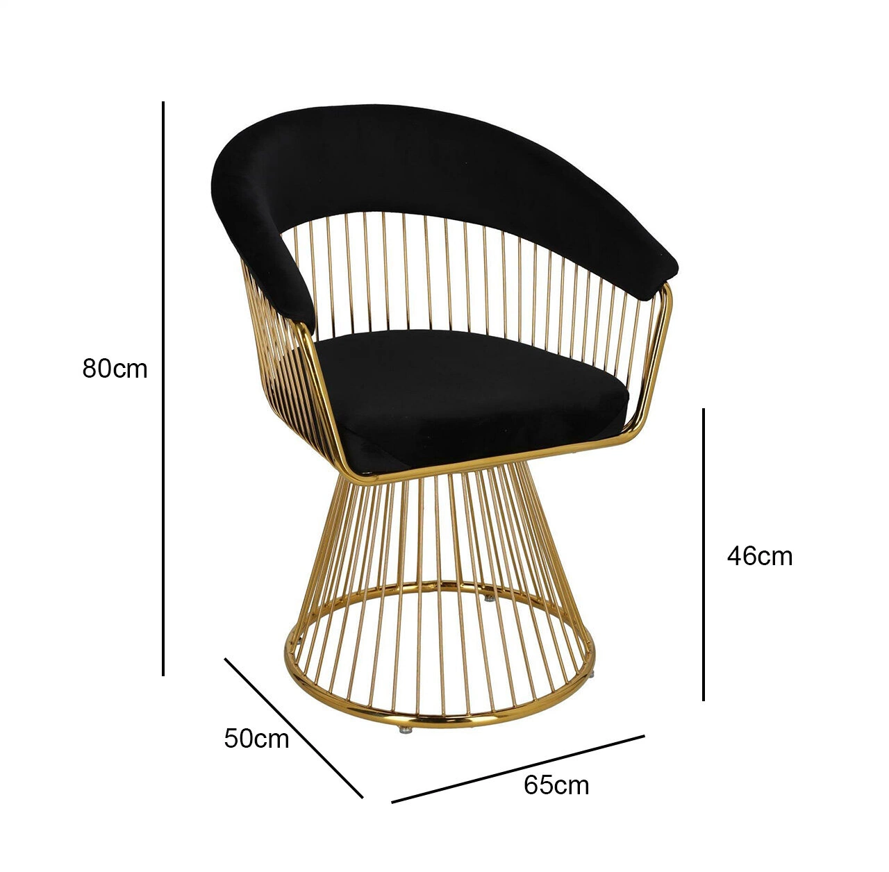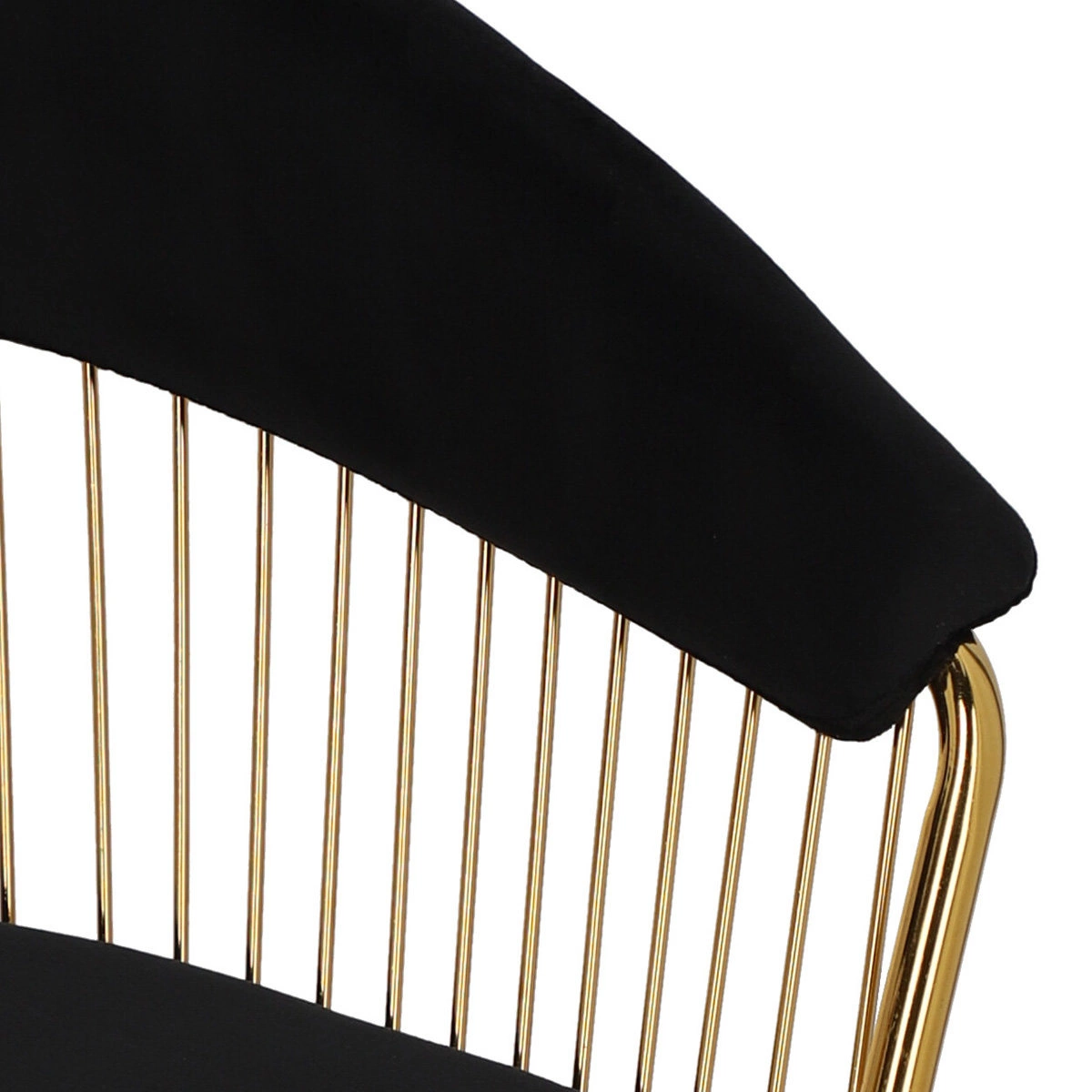 Extrémně okouzlující křeslo Feeny glamour je o koncentrovaném půvabu a luxusu. Toto křeslo s černým sametovým sedákem a opěradlem a krásnou zlatou kovovou podnoží udělá tečku za elegantním luxusním obývacím pokojem. Nebo snad hledáte originální židli k toaletnímu stolku? Křeslo Feeny se při líčení jistě osvědčí. Neobvyklou základnu židle tvoří kruh, z něhož směrem k sedadlu vystupuje množství zlatých konzol. Základna je chráněna průhlednými nožičkami, které zabraňují sklouznutí židle. Sedák, opěradlo a područky tvoří jakási skořepina, jejíž tvar je dán množstvím tvarovaných zlatých prutů. Na sedadle je 12 cm silný polštář čalouněný měkkou látkou. Opěradlo a područky jsou navíc čalouněné sametovou látkou, která je příjemná na dotek. Židle nevyžaduje montáž