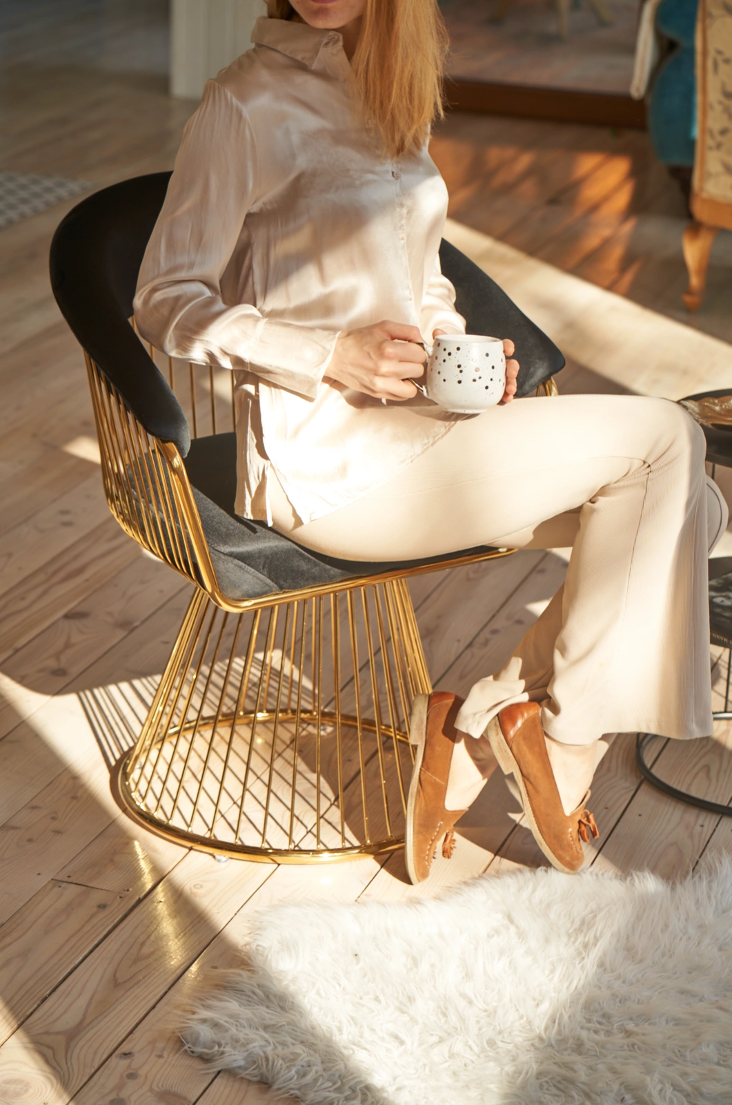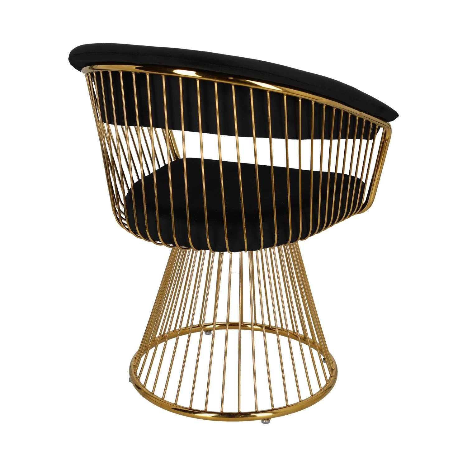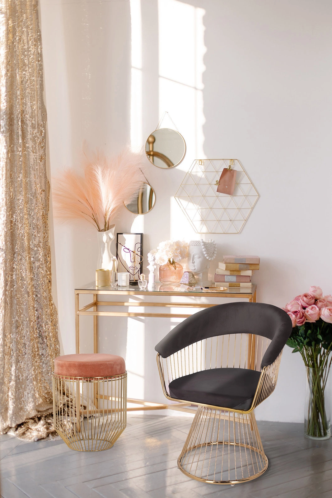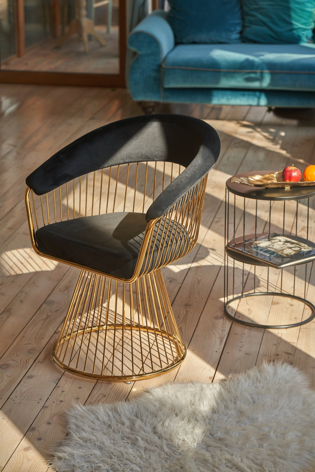 Extrémně okouzlující křeslo Feeny glamour je o koncentrovaném půvabu a luxusu. Toto křeslo s černým sametovým sedákem a opěradlem a krásnou zlatou kovovou podnoží udělá tečku za elegantním luxusním obývacím pokojem. Nebo snad hledáte originální židli k toaletnímu stolku? Křeslo Feeny se při líčení jistě osvědčí. Neobvyklou základnu židle tvoří kruh, z něhož směrem k sedadlu vystupuje množství zlatých konzol. Základna je chráněna průhlednými nožičkami, které zabraňují sklouznutí židle. Sedák, opěradlo a područky tvoří jakási skořepina, jejíž tvar je dán množstvím tvarovaných zlatých prutů. Na sedadle je 12 cm silný polštář čalouněný měkkou látkou. Opěradlo a područky jsou navíc čalouněné sametovou látkou, která je příjemná na dotek. Židle nevyžaduje montáž