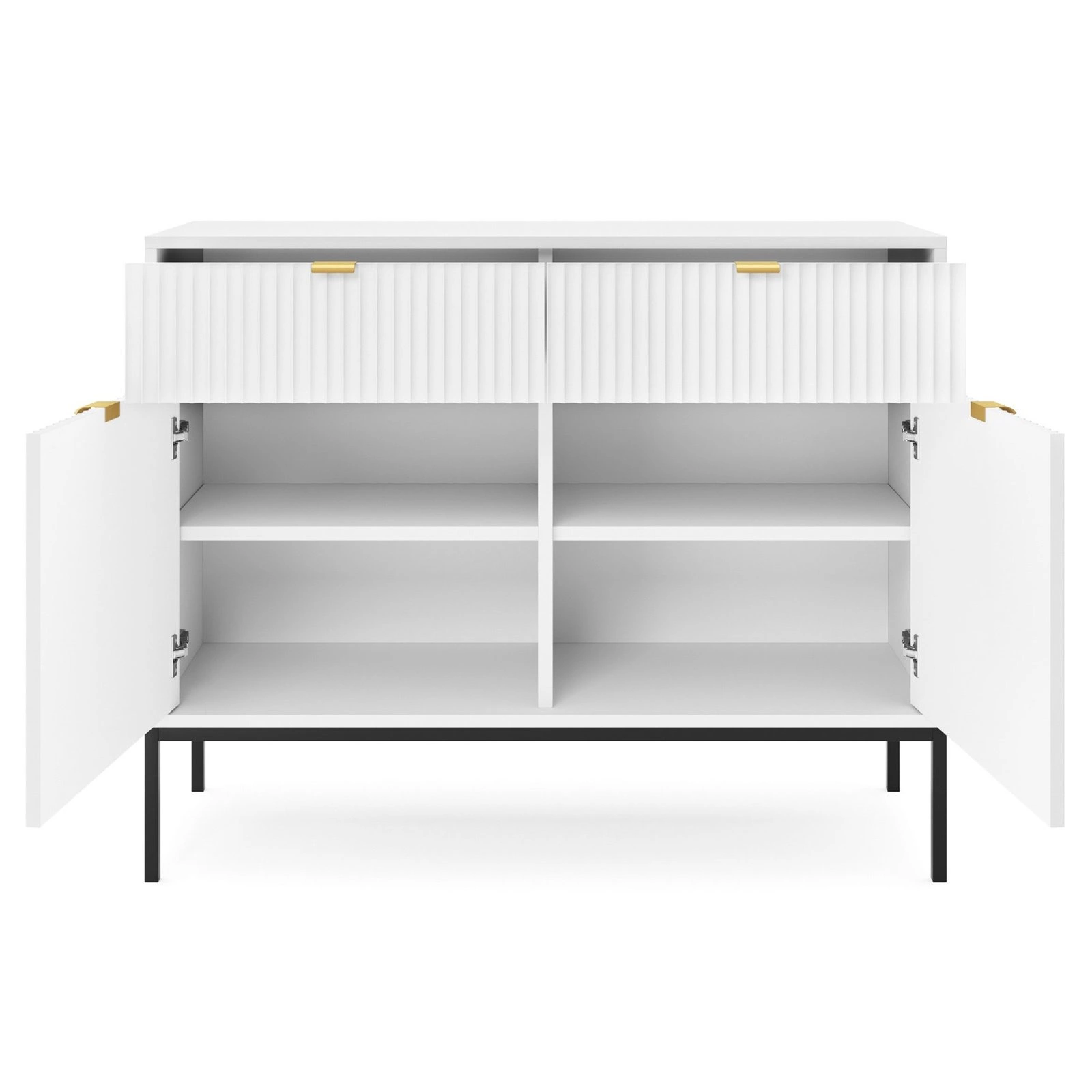 Bílá moderní komoda Delicious s drážkovaným povrchem, zásuvkami a nožičkami 104 cm do obýváku