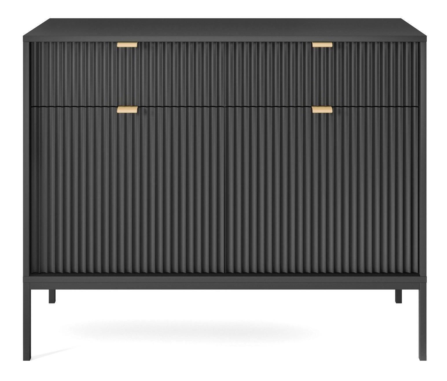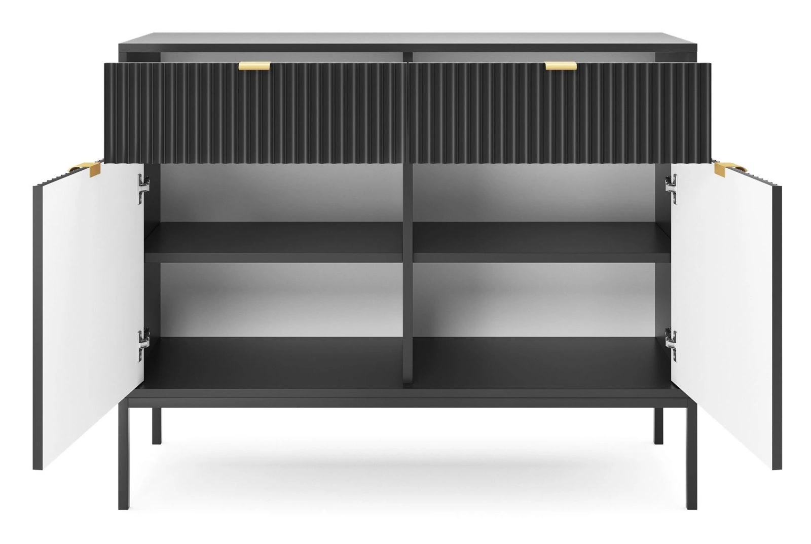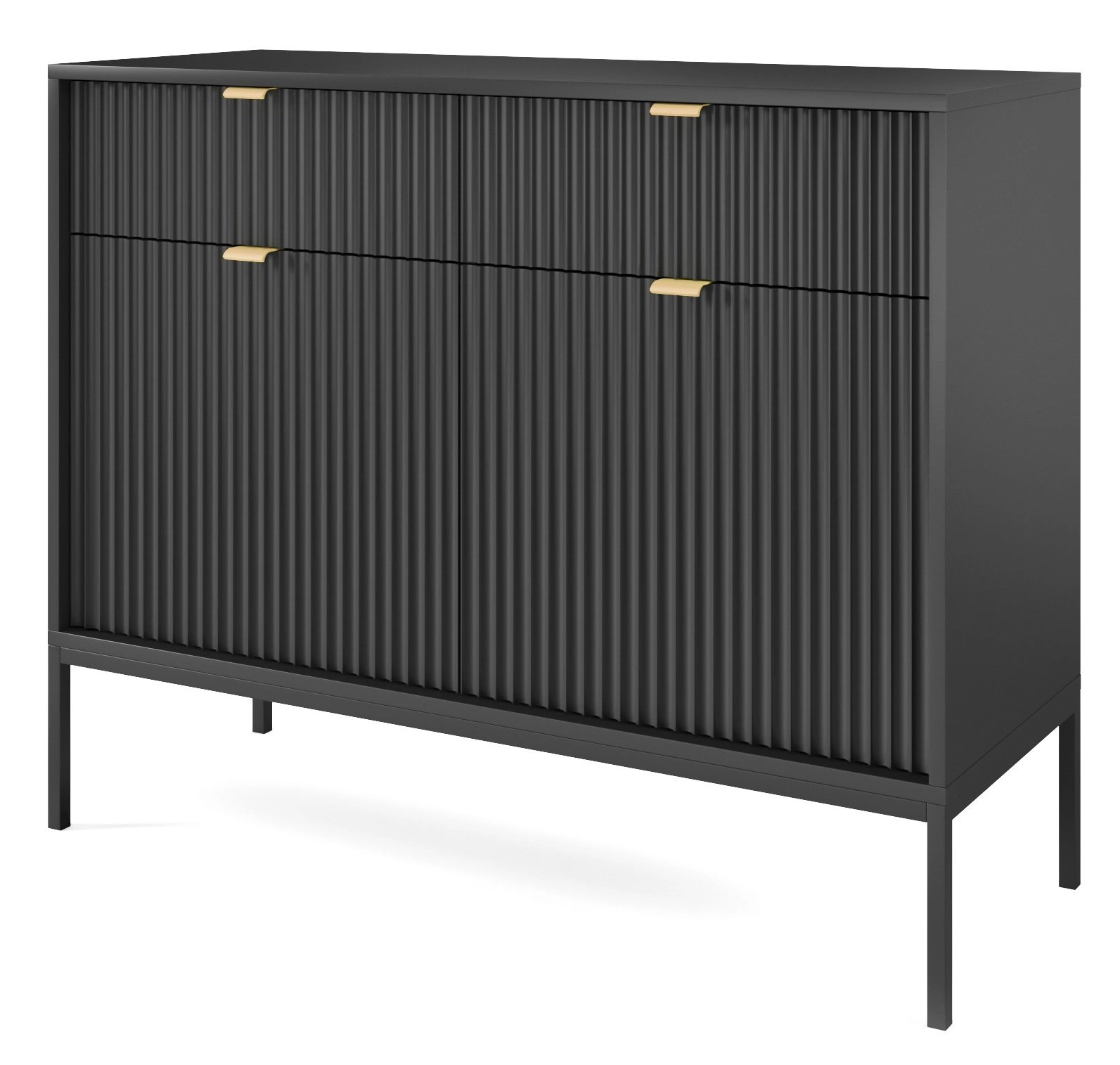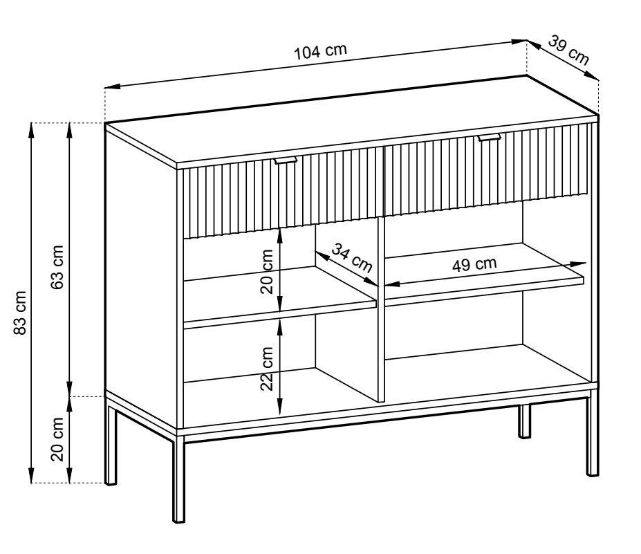 Díky chytrému designu je komoda obzvláště praktická a přizpůsobivá. S šířkou 104 cm, výškou 83 cm a hloubkou 39 cm bude komoda nepochybně odpovědí na vaše požadavky. Do komody se snadno vejdou větší předměty i všechny potřebné drobnosti, protože komoda má dvě zásuvky a dvě prostorné skříňky. Komoda je také vybavena čtyřmi policemi, na které si můžete uložit věci denní potřeby. Celá komoda stojí na čtyřech nohách, takže je nábytek stabilní, i když je naplněný až po okraj. Pod komodu se vejde jakýkoli úklidový robot, protože její základna má vysoké nohy. Tato výhoda také usnadňuje tradiční vysávání a vytírání podlahy. Komoda je natolik univerzální a užitečná, že se hodí nejen do obývacího pokoje, ale také do ložnice, jídelny nebo předsíně. Komodu můžete snadno umístit do různě velkých místností díky tomu, že je poměrně standardvelká a zároveň opravdu prostorná. Komodu snadno sladíte s nábytkem, který už v pokoji máte, ale pokud ji obohatíte o výrazné akcenty, stane se základním a nadstandardním kusem nábytku.
