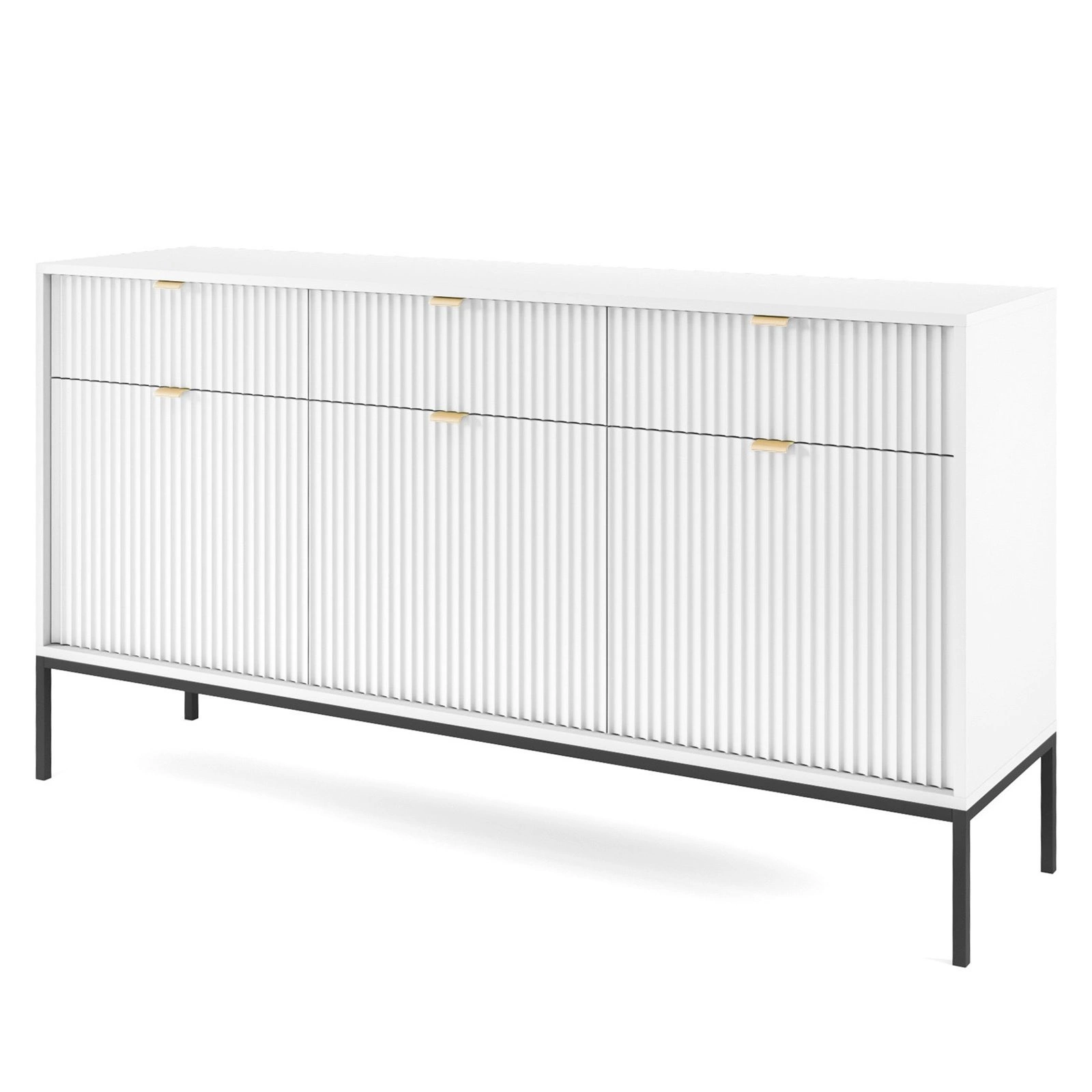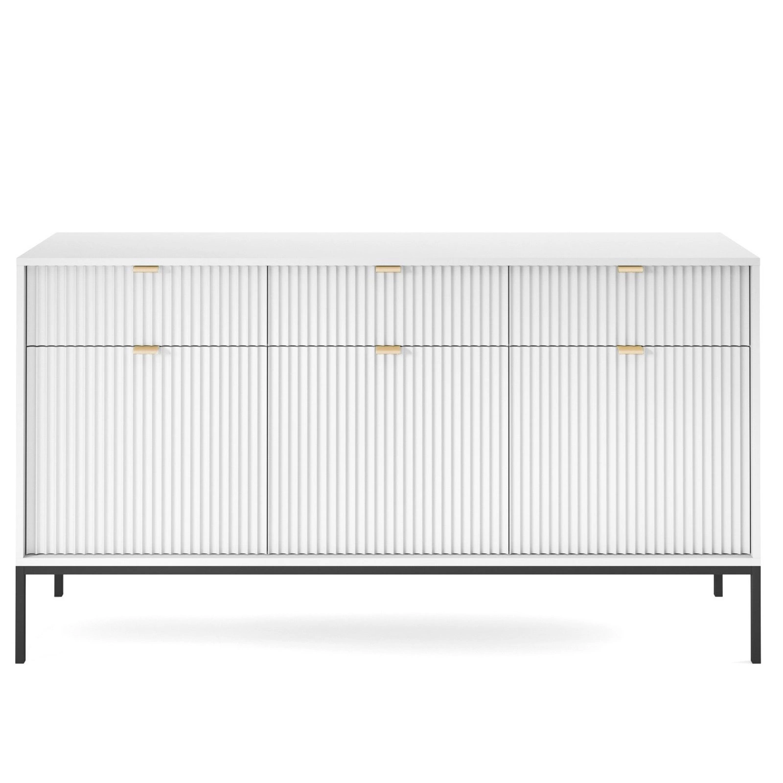 Komoda Delicious od značky Intesi je moderní bílá komoda s působivou šířkou 154 cm, která dokonale spojuje minimalistický design s praktickým využitím. Zaujme ryhovanými čely, matným povrchem a třemi prostornými zásuvkami i skříňkami se šesti policemi. Stabilní konstrukce na vysokých černých kovových nožkách zajišťuje, že tento nábytek se skvěle hodí jako komoda do obývacího pokoje, ložnice, předsíně nebo jídelny.