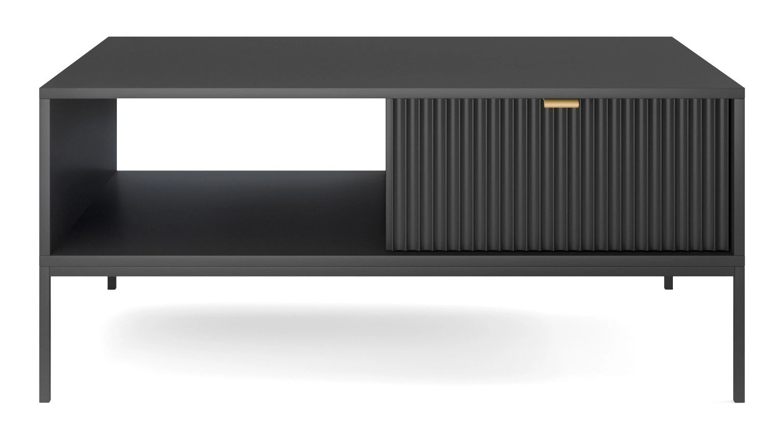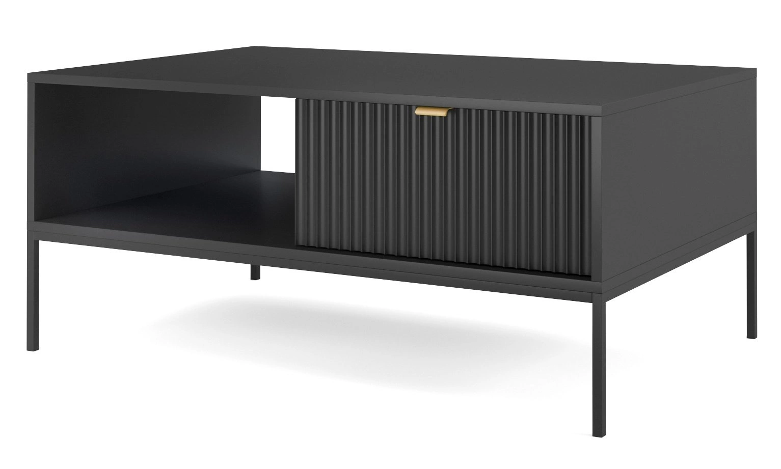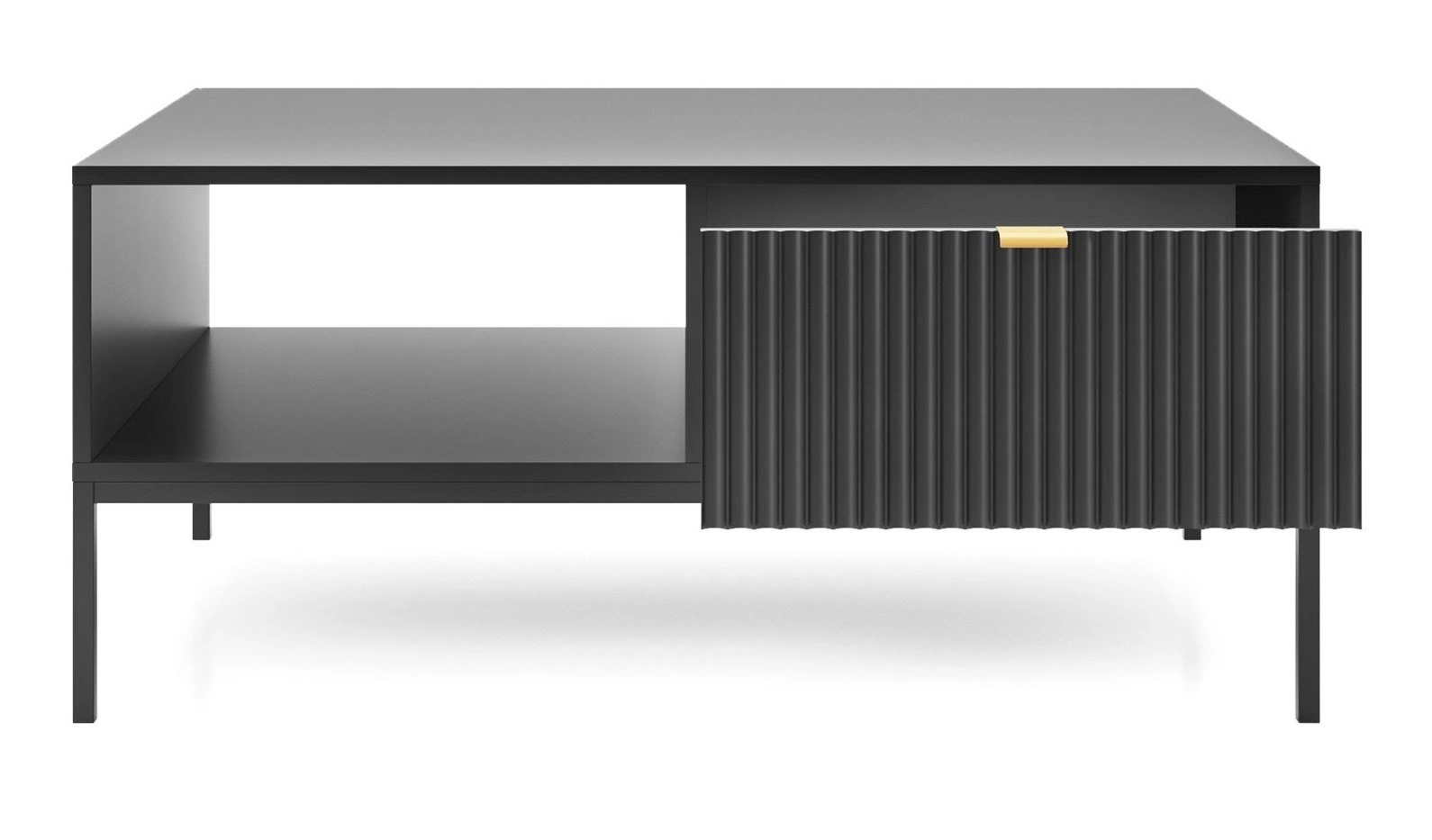 Konferenční stolek Delicious černý glamour se zásuvkou a policí značky Intesi je ideální volbou pro ty, kteří hledají originální a zároveň praktické vybavení obývacího pokoje. Obdélníková deska o rozměrech 104 × 68 cm poskytuje dostatek prostoru na šálek kávy, oblíbenou knihu i dekorativní doplňky. Černá barva, rýhovaná čelní strana zásuvky a zlaté kovové úchyty podtrhují exkluzivní charakter stolku, který se skvěle hodí do glamour a moderních interiérů.Objevte konferenční stolek Delicious – moderní glamour styl pro váš obývací pokoj