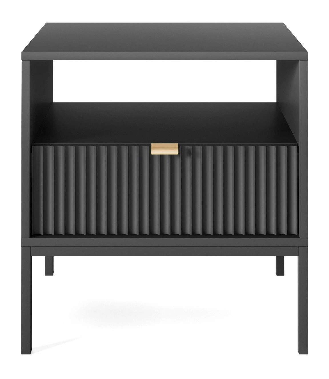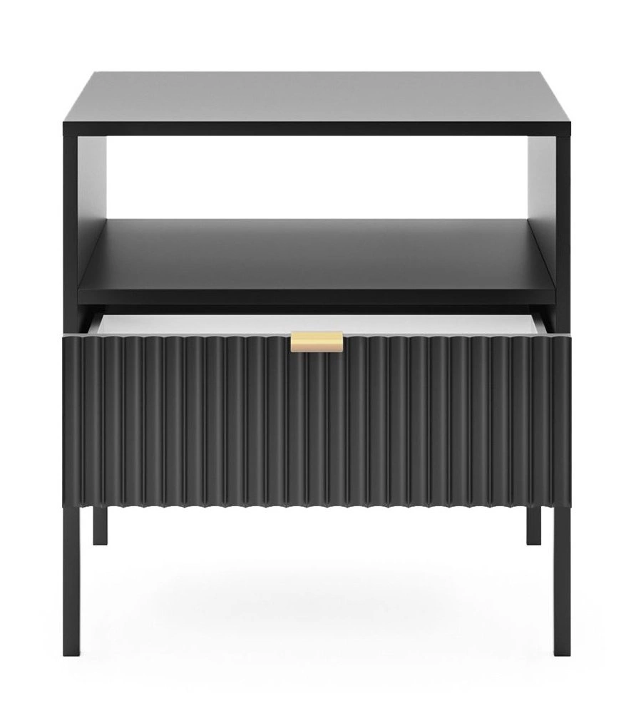 Černý noční stolek s drážkovanou čelní stranou a zásuvkou 54 cm glamour Intesi Delicious je výrazným prvkem do ložnice, který spojuje eleganci glamour stylu s praktičností každodenního používání. Nábytek o šířce 54 cm a výšce 56 cm je vyroben z pevné laminované desky a kovu, což zajišťuje dlouhou životnost. Typické drážkování na čele a zlatá úchytka podtrhují luxusní design, zatímco vysoká podnož na čtyřech nohách dodává stolku lehkost a zjednodušuje údržbu čistoty.