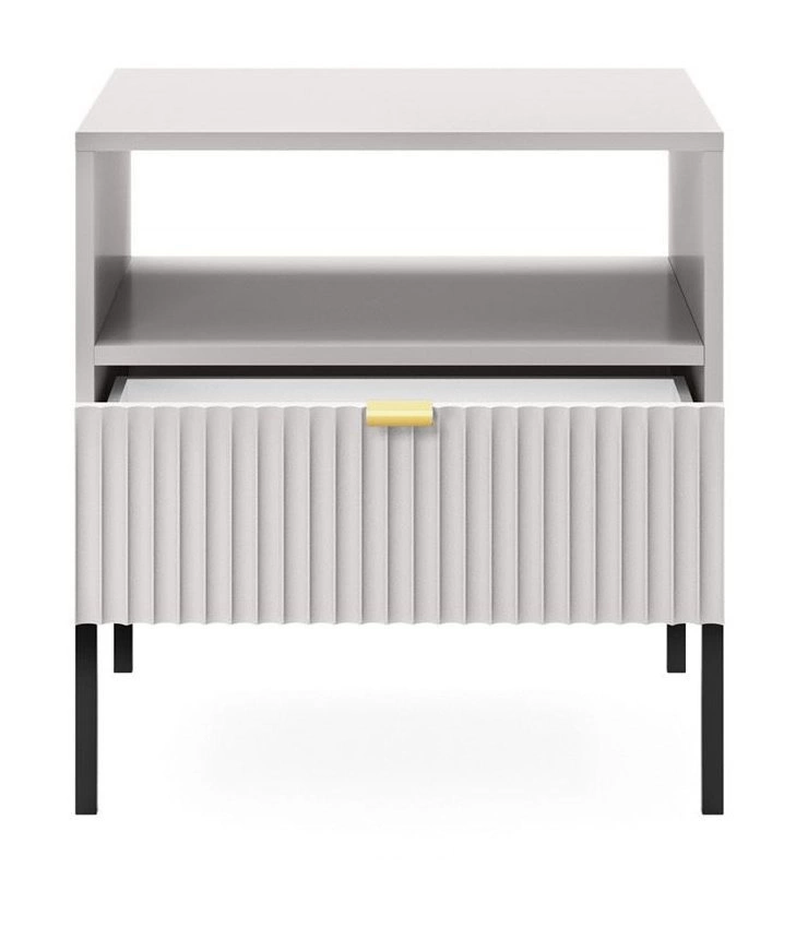 Pokud toužíte po interiéru s nádechem luxusu, šedý noční stolek Delicious skvěle zapadne do moderní ložnice. Typické vertikální rýhování na čele zásuvky přitahuje pohled a dává nábytku originální charakter, zatímco neutrální odstín šedé snadno sladíte s dalšími doplňky. Černý, minimalistický podstavec podtrhuje glamour styl, dodává prostoru lehkost a moderní vzhled.