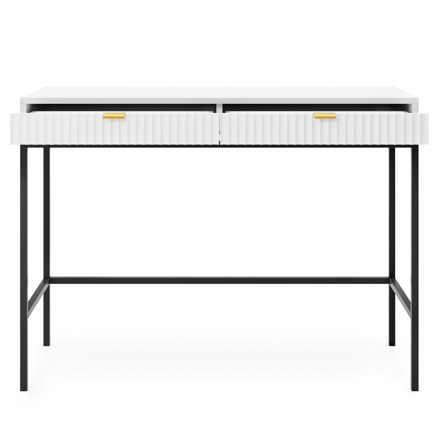 Toaletní stolek Delicious s drážkovanými čely zásuvek ozdobí náš interiér v moderním stylu a dodá mu specifický půvab. Žlábkovaná čela stolu zdůrazňují stylovou hliníkovou rukojeť ve zlaté barvě. Prostorná konzola o šířce 104 cm a hloubce 50 cm vám umožní uspořádat nejen klíče, ale i další předměty, jako jsou nabíječky na telefon nebo kosmetika. Konzola stojí na stabilních kovových nohách. Stůl na vysokých nohách je pohodlný kus nábytku, protože se pod ním snadno vysává a vytírá podlaha. Tenké elegantní nožky také přispívají k jeho vizuální lehkosti, která je v malých místnostech velmi důležitá.Rozměry: 104x67x7cm, 111x55x7cm, hmotnost: 4,5 a 20 kg