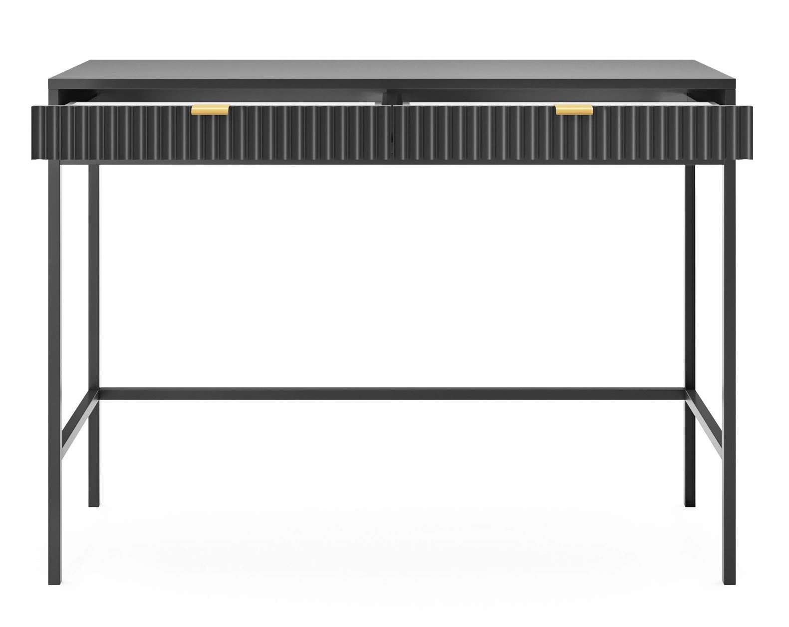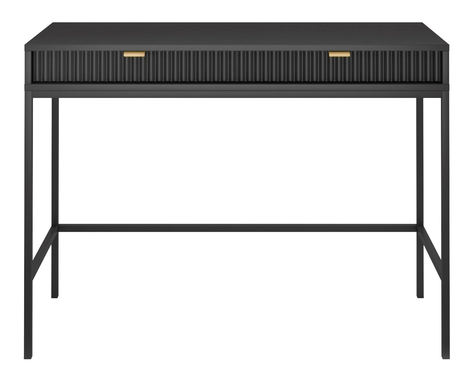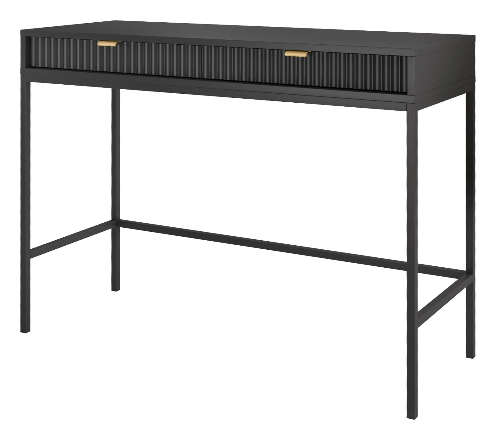 Toaletní stolek Delicious černý s drážkovanými zásuvkami od značky Intesi je moderní kus nábytku do ložnice, který zaujme elegantním designem a praktickým využitím. Šířka 104 cm a hloubka 50 cm poskytují dostatek prostoru pro každodenní líčení i uložení kosmetiky, šperků nebo drobností. Masivní deska z nábytkové desky, stylové drážkované čelo zásuvek a pevná kovová konstrukce na vysokých nohách dělají z tohoto stolku ideální volbu pro moderní interiéry a dodávají místnosti nádech luxusu.