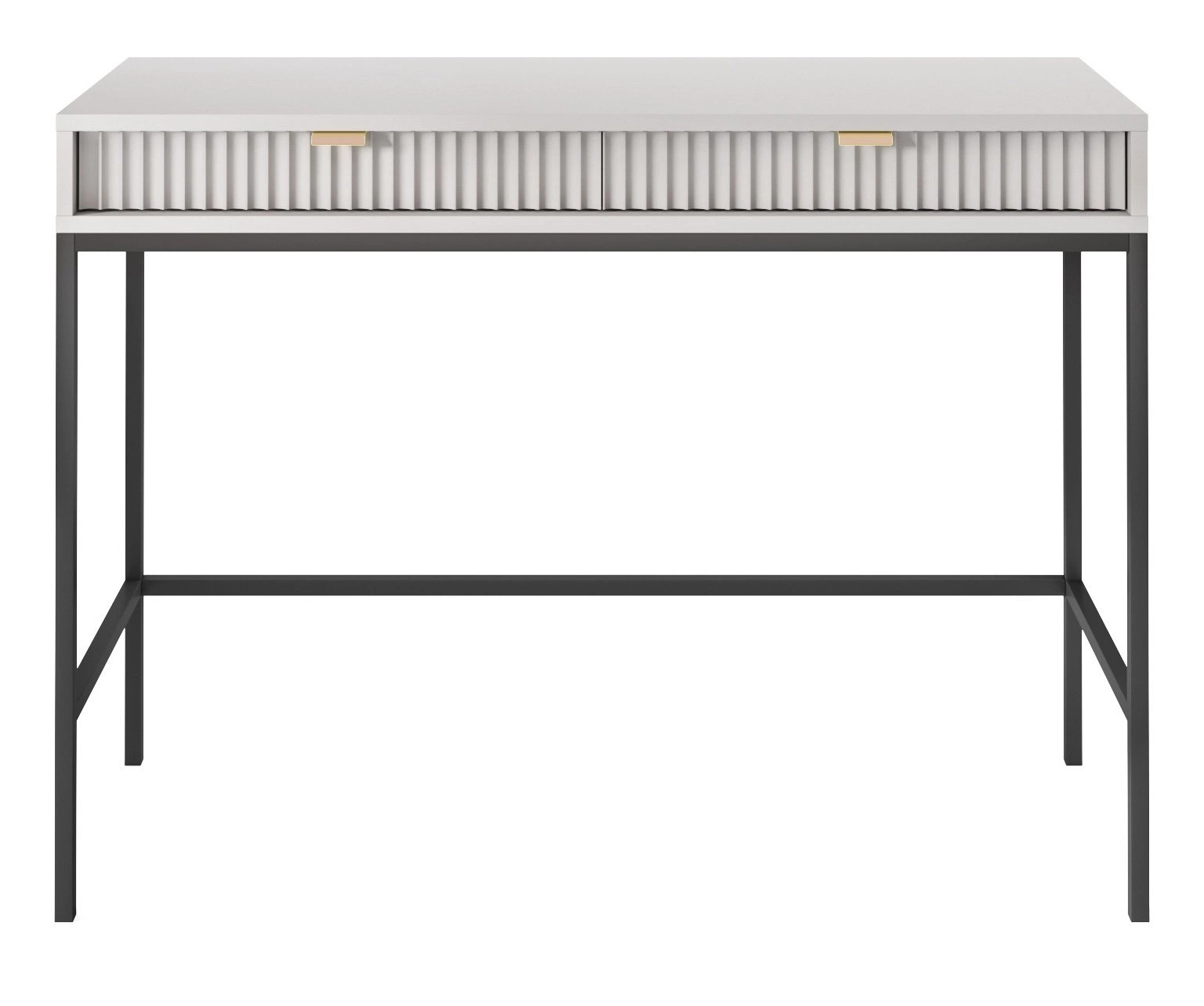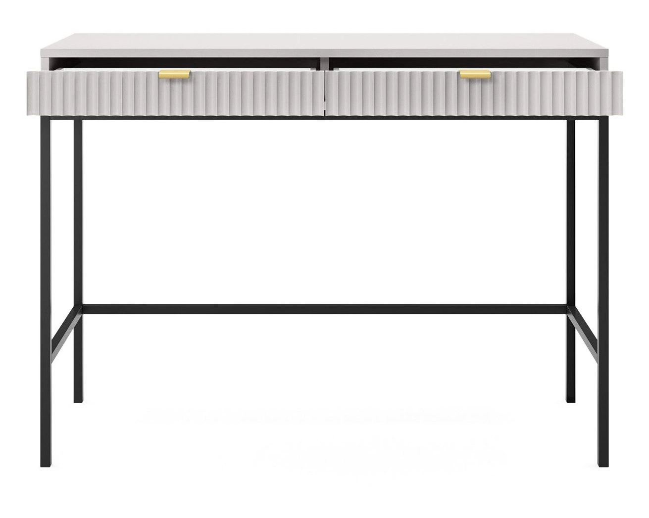 Toaletní stolek Delicious od značky Intesi je moderní kus nábytku do ložnice, který spojuje profilované, šedé čelo zásuvek s elegantní kovovou podnoží. Se šířkou 104 cm a hloubkou 50 cm nabízí prostornou pracovní desku a dvě praktické zásuvky, které pohodlně uloží veškeré potřebné doplňky pro líčení i každodenní pečovatelské rituály. Vysoké nohy dodávají stolku vzdušnost a usnadňují úklid, zatímco stylové provedení zajišťuje, že toaletní stolek se zásuvkami Delicious perfektně zapadne do moderního interiéru vaší ložnice.