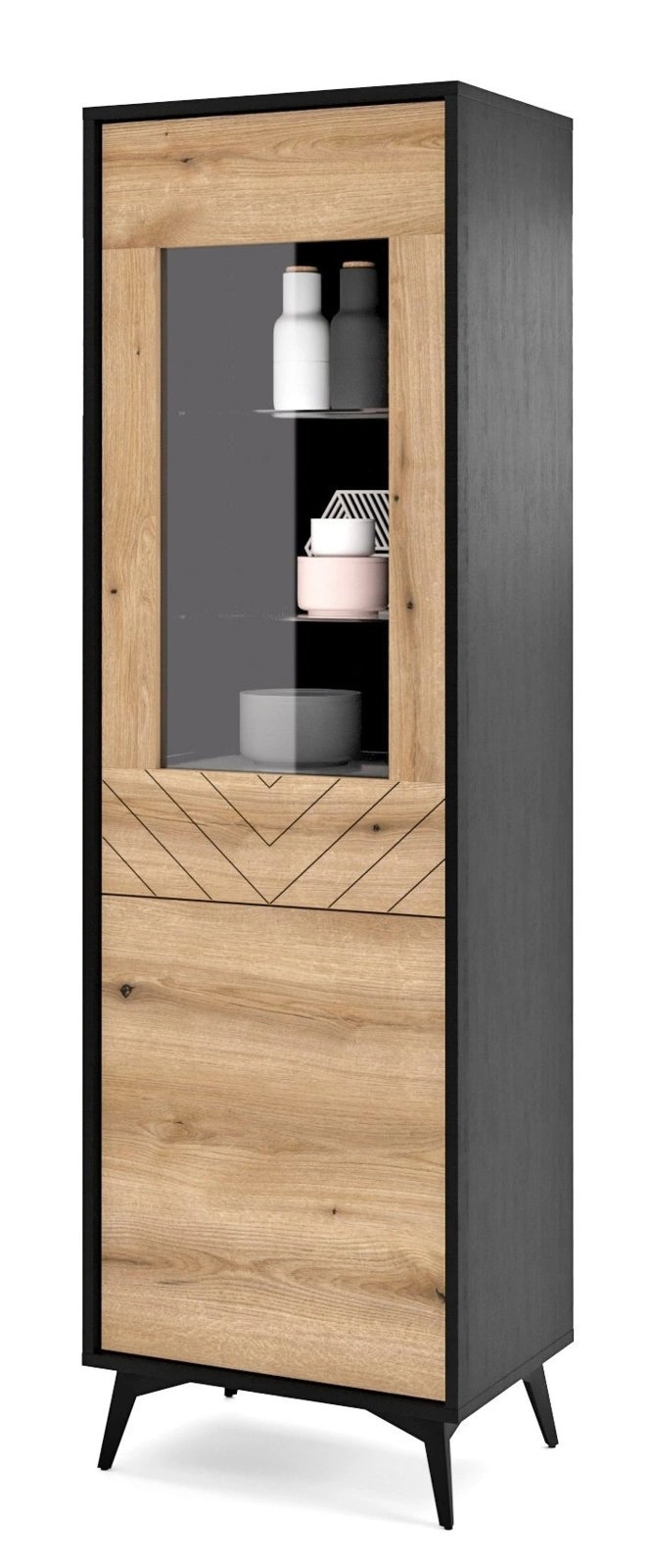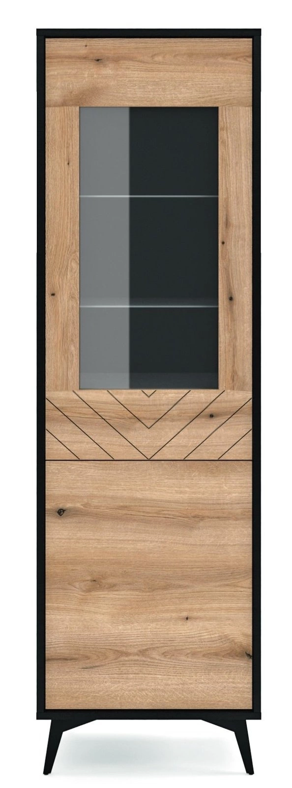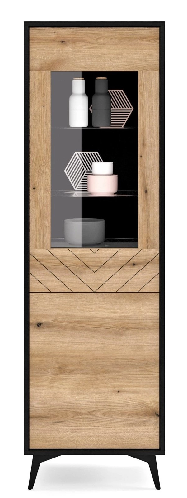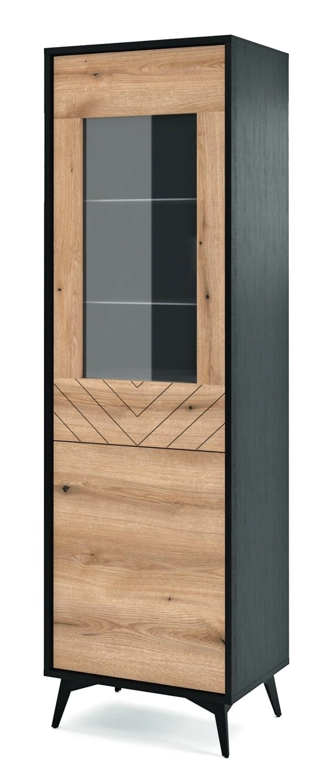 Kombinace přírodního dubového dekoru s černou kovovou podstavou zajišťuje, že knihovna Fargo perfektně zapadne do moderních a industriálních interiérů. Přední část s geometrickým vzorem ve stylu rybí kosti zaujme na první pohled a dodá prostoru originální charakter. Jemný tvar na čtyřech štíhlých nohách působí vzdušně a nezahlcuje ani menší místnosti. Loftová vitrína se skvěle hodí nejen do obýváku, ale i do předsíně nebo ložnice, kde může sloužit jako knihovna nebo stylová vitrína na oblíbené doplňky.