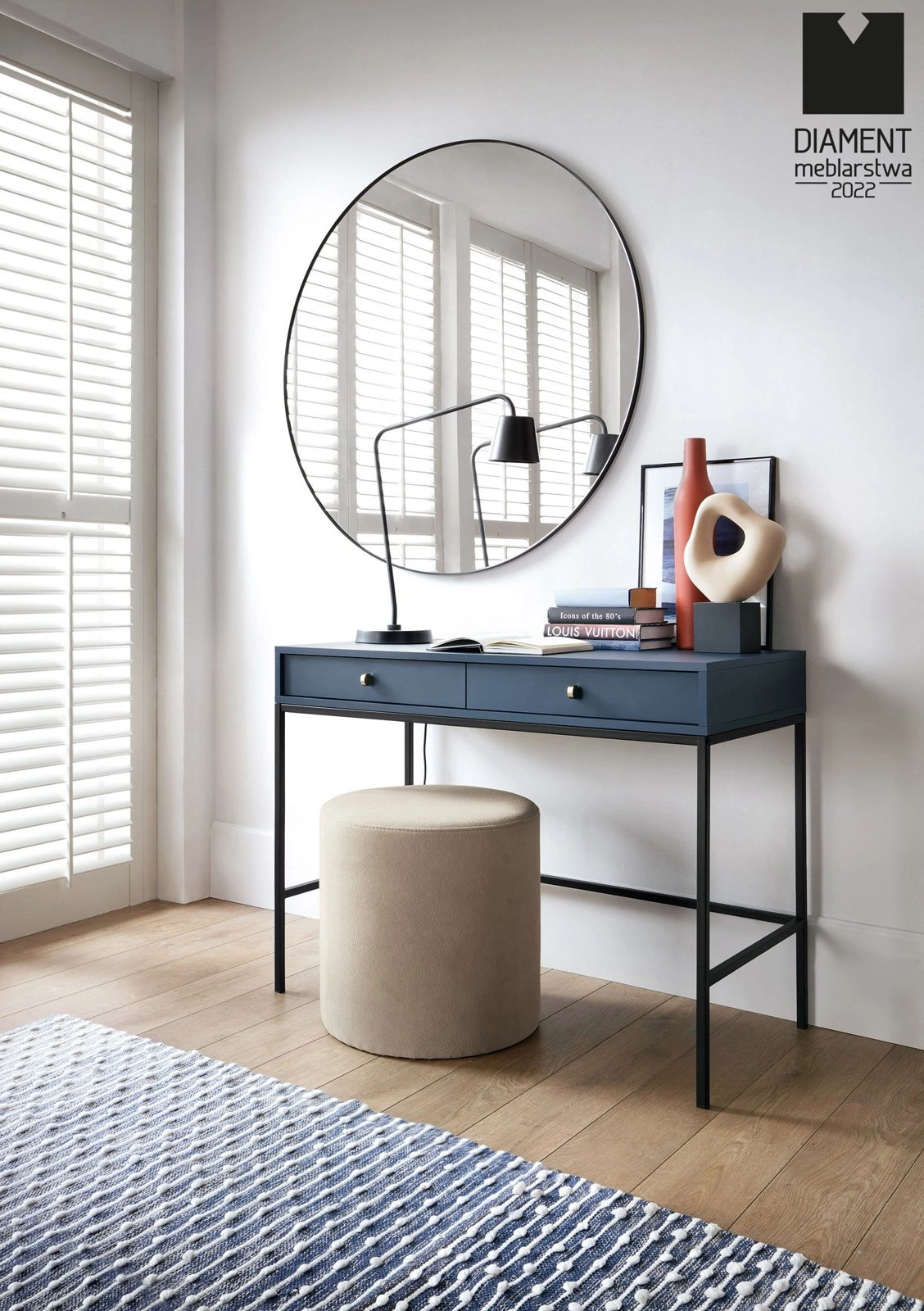 Moderní toaletní stolek Evora v glamour stylu zaujme minimalistickou siluetou, která perfektně zapadne do elegantního zařízení ložnice. Hluboká modrá deska krásně kontrastuje s černými, štíhlými nohami, a decentní kovové úchytky dodávají celku sofistikovaný vzhled. Povrch o šířce 104 cm a hloubce 50 cm poskytuje dostatek prostoru pro líčení a péči, aniž by zabíral příliš místa i v menších pokojích.