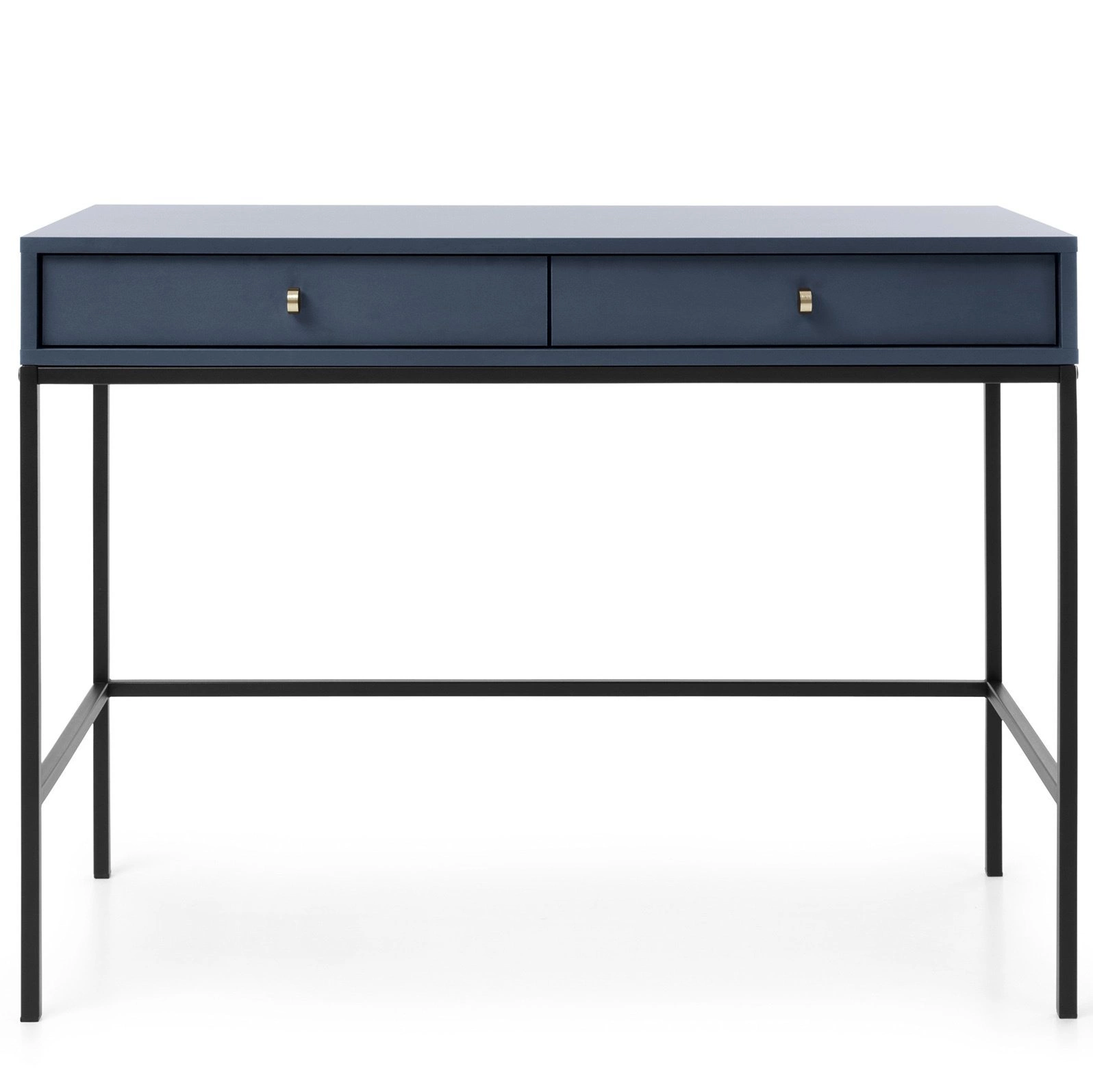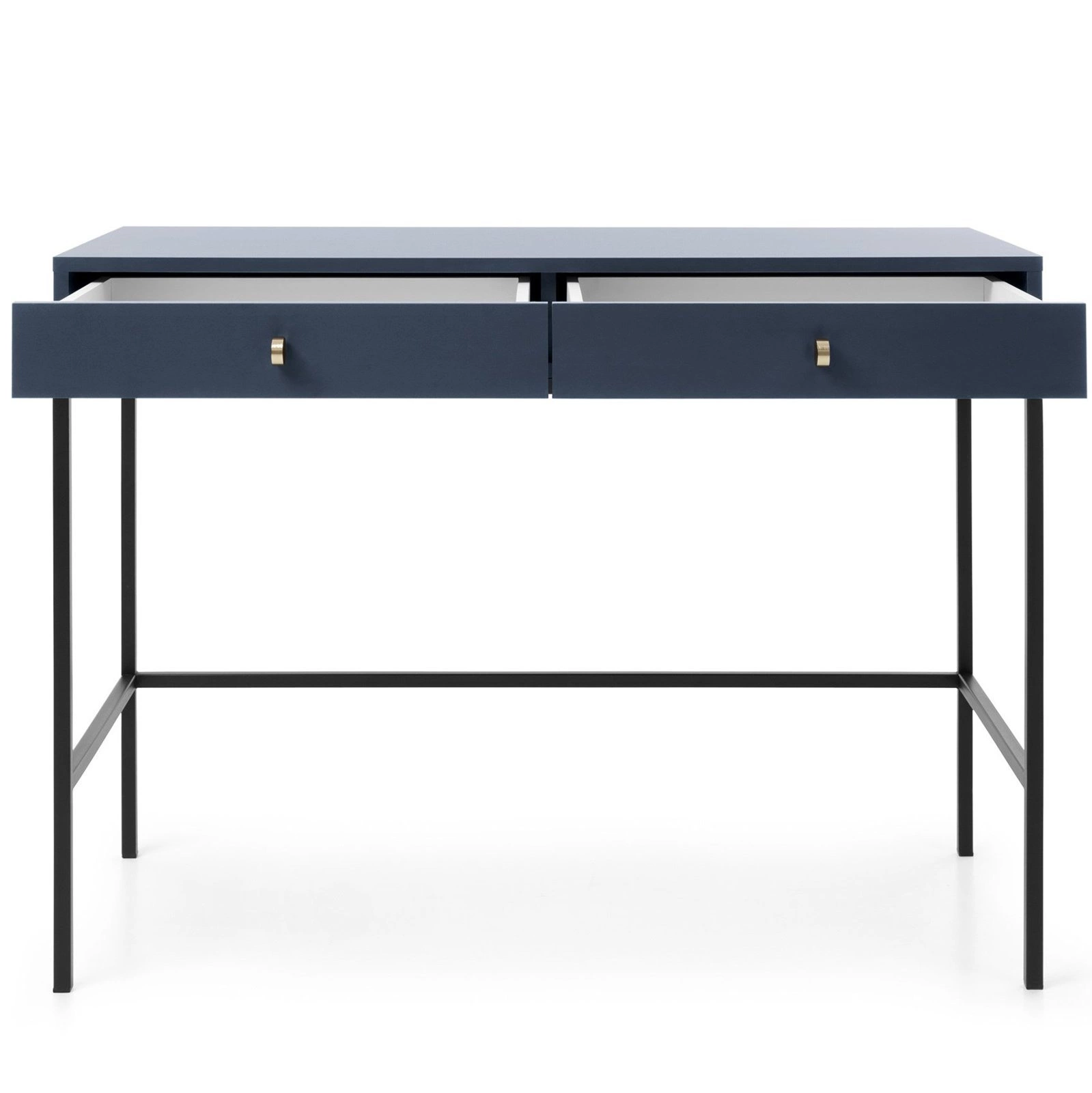 Toaletní stolek Evora od značky Intesi je moderní glamour toaletka v hlubokém, tmavě modrém odstínu, o šířce 104 cm, ideální do ložnice. Elegantní deska z nábytkové desky a černá kovová podnož s vysokými nohami a dvěma prostornými zásuvkami tvoří funkční a stylový nábytek na každodenní líčení nebo uložení šperků. Díky promyšlené konstrukci se toaletní stolek Evora skvěle hodí jak jako kosmetický stolek na make-up, tak jako originální konzole do moderního interiéru.