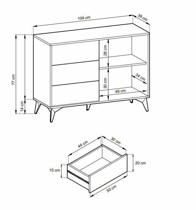 Tři prostorné zásuvky poskytují pohodlný úložný prostor – od dokumentů a textilu až po drobnosti a domácí doplňky. Systém push to open umožňuje rychlé a komfortní otevírání zásuvek bez tradičních úchytek, což podtrhuje moderní styl a usnadňuje udržení čistého vzhledu čelního panelu. Komoda se zásuvkami skvěle poslouží jako komoda pod televizi do obývacího pokoje, praktický úložný prostor v ložnici nebo funkční nábytek do předsíně.