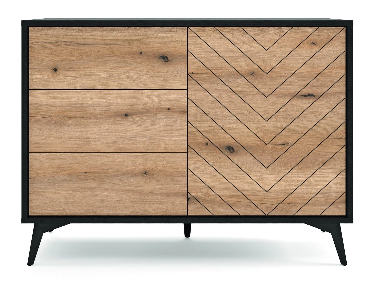 Jedinečný design komody Fargo zaujme jemným čelním panelem ve vzoru rybí kosti, který je stylovou ozdobou každé místnosti. Přírodní barva dubu zútulňuje prostor a navozuje příjemnou atmosféru, zatímco minimalistické linie zdůrazňují skandinávský charakter nábytku. Čtyři štíhlé, černé nohy dodávají lehkost, díky čemuž komoda na nohách působí moderně a opticky nezatěžuje ani menší prostory.