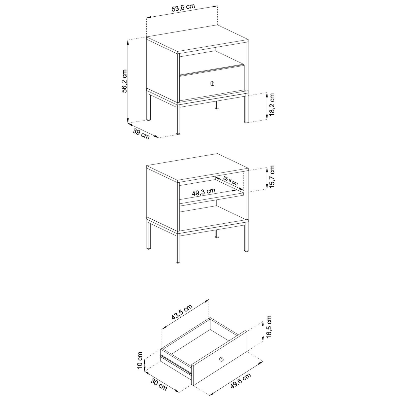 Minimalistická noční skříňka na vysokých nožkách je nábytek pro velmi náročné uživatele. Skříňka s hladkým čelem a klasickým tvarem umožní zařídit i ten nejnáročnější interiér. Rukojeť skříně ve tvaru kosočtverce je vyrobena z hliníku. Základna skříňky je tvořena vysokými nohami, které usnadňují přístup čisticích robotů pod komodu. Prostorná a elegantní skříň je řešením nejen pro moderní interiéry. Skříňka se bude krásně vyjímat i v boho nebo dokonce eklektickém interiéru. Rozměry: 51x25x6cm, 61x43x12cm, hmotnost: 3 a 14kg