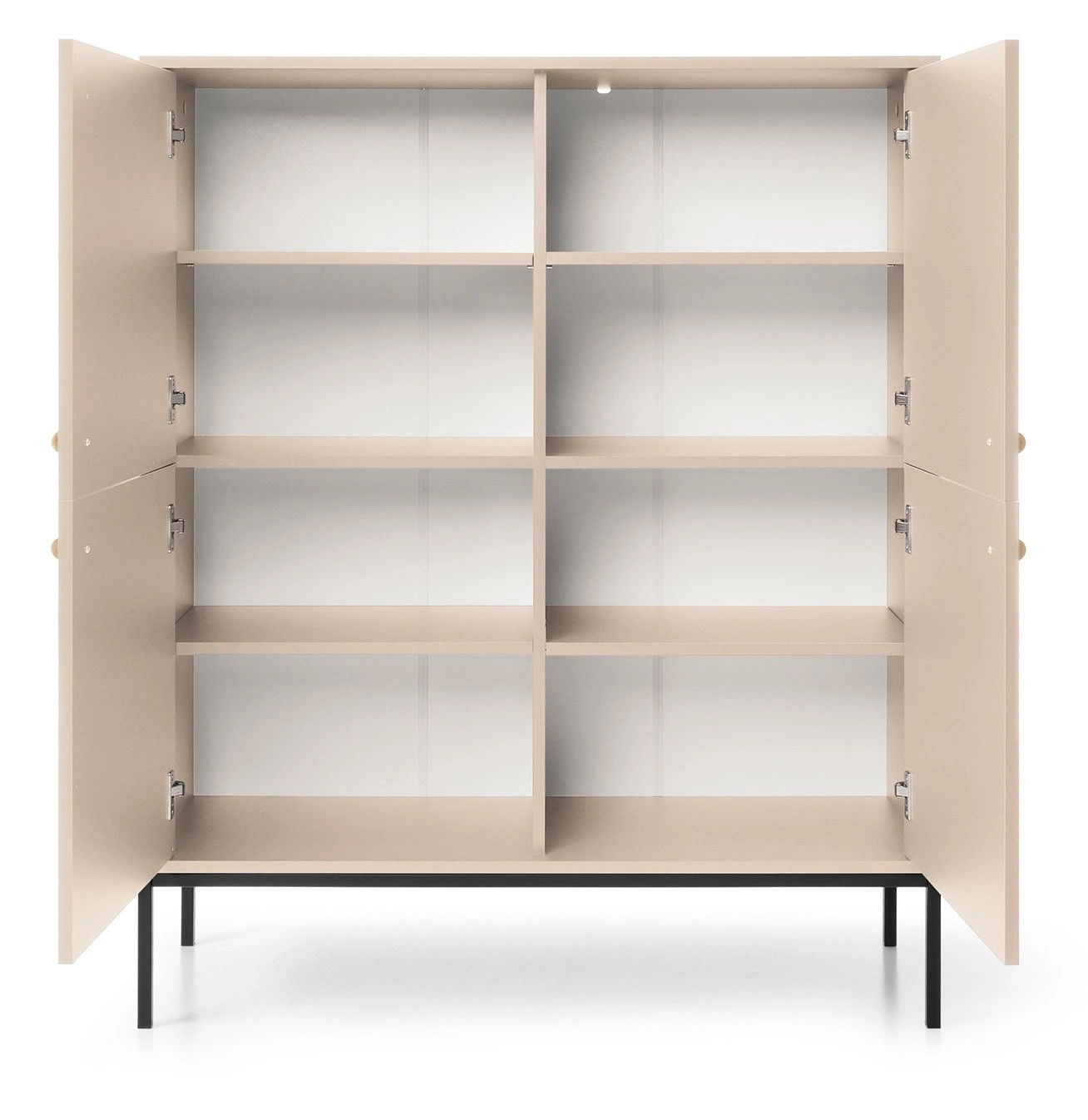 Komoda Evora vysoká béžová 125 cm od značky Intesi je moderní kus nábytku na nožkách, který v sobě spojuje funkčnost a eleganci. Díky matnému povrchu v odstínu béžové a černým kovovým detailům se komoda skvěle hodí do obývacího pokoje, ložnice nebo předsíně. S výškou 125 cm, šířkou 104 cm a hloubkou 39 cm nabízí dostatek úložného prostoru a její minimalistický design stylově doplní moderní interiéry.