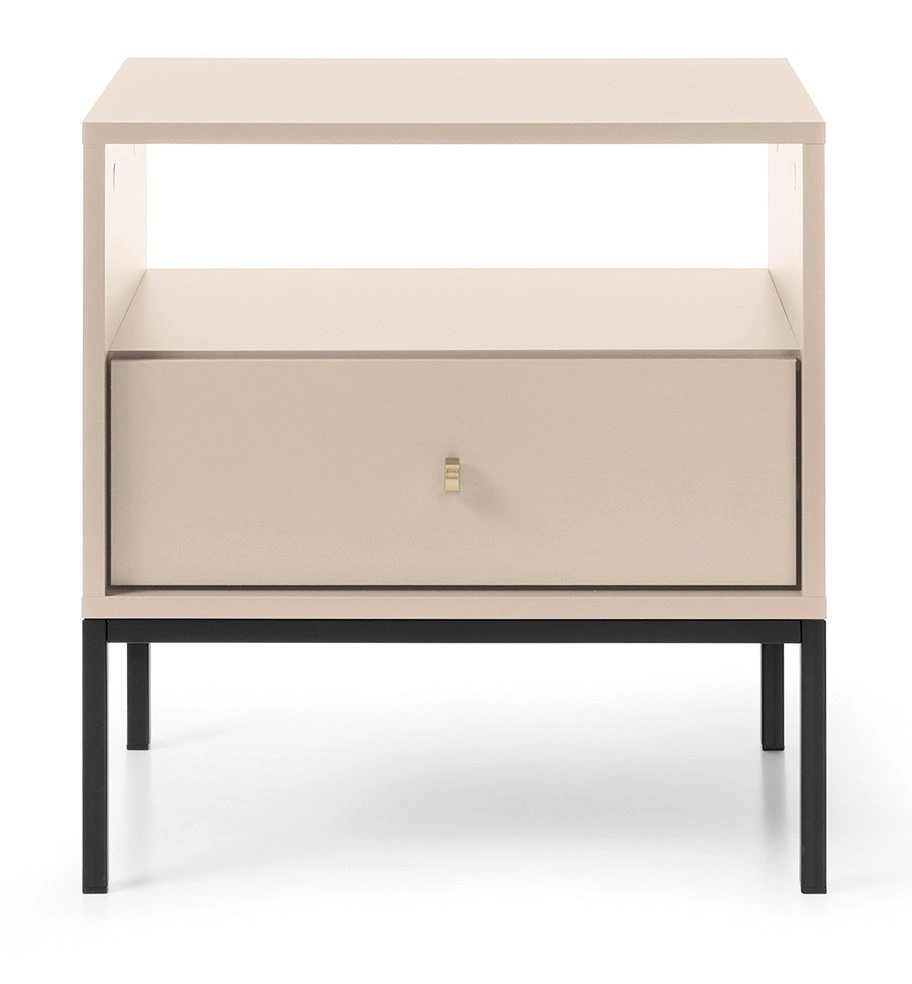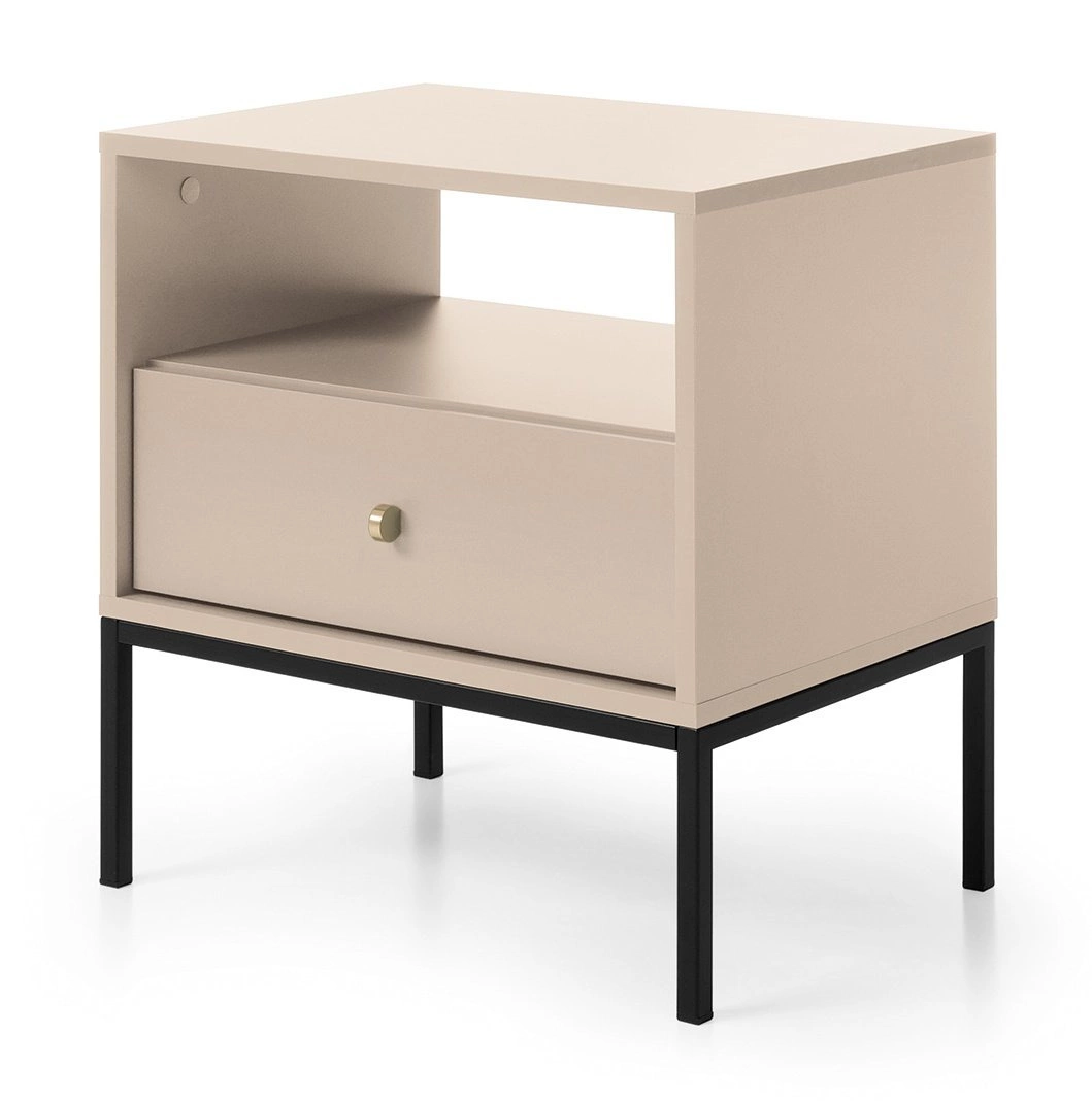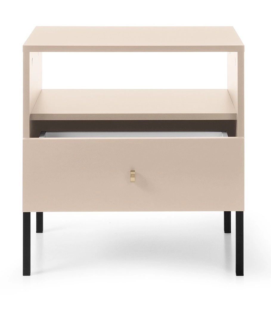 Minimalistická noční skříňka na vysokých nožkách je nábytek pro velmi náročné uživatele. Skříňka s hladkým čelem a klasickým tvarem umožní zařídit i ten nejnáročnější interiér. Rukojeť skříně ve tvaru kosočtverce je vyrobena z hliníku. Základna skříňky je tvořena vysokými nohami, které usnadňují přístup čisticích robotů pod komodu. Prostorná a elegantní skříň je řešením nejen pro moderní interiéry. Skříňka se bude krásně vyjímat i v boho nebo dokonce eklektickém interiéru. Rozměry: 51x25x6cm, 61x43x12cm, hmotnost: 3 a 14kg