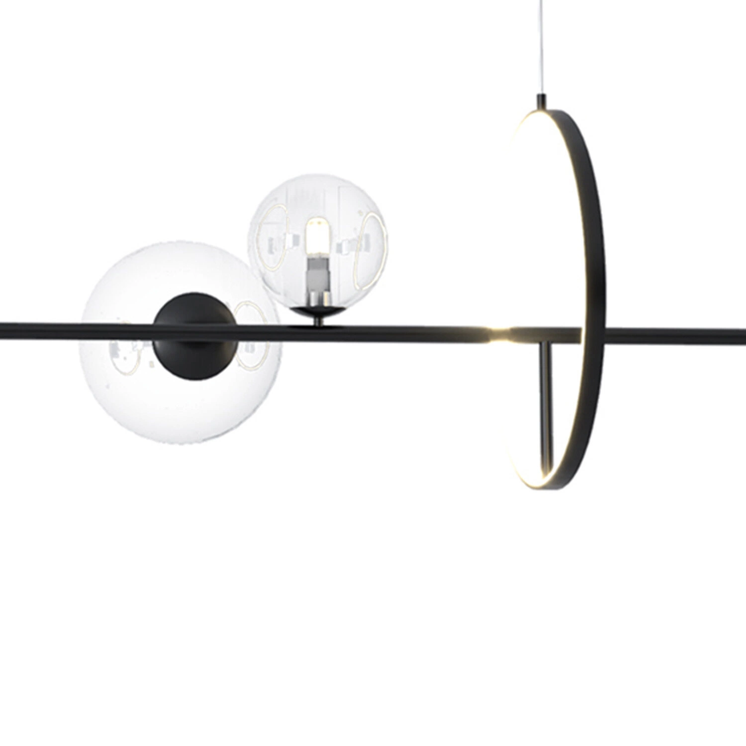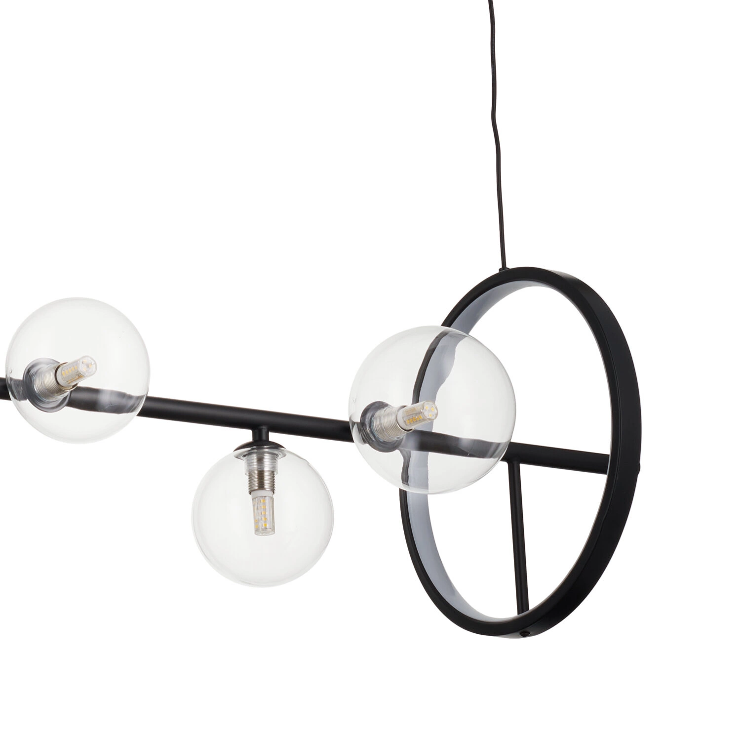 Designové závěsné svítidlo ORION LONG s dekorativním led kruhem je zakončeno sedmi skleněnými koulemi různých velikostí