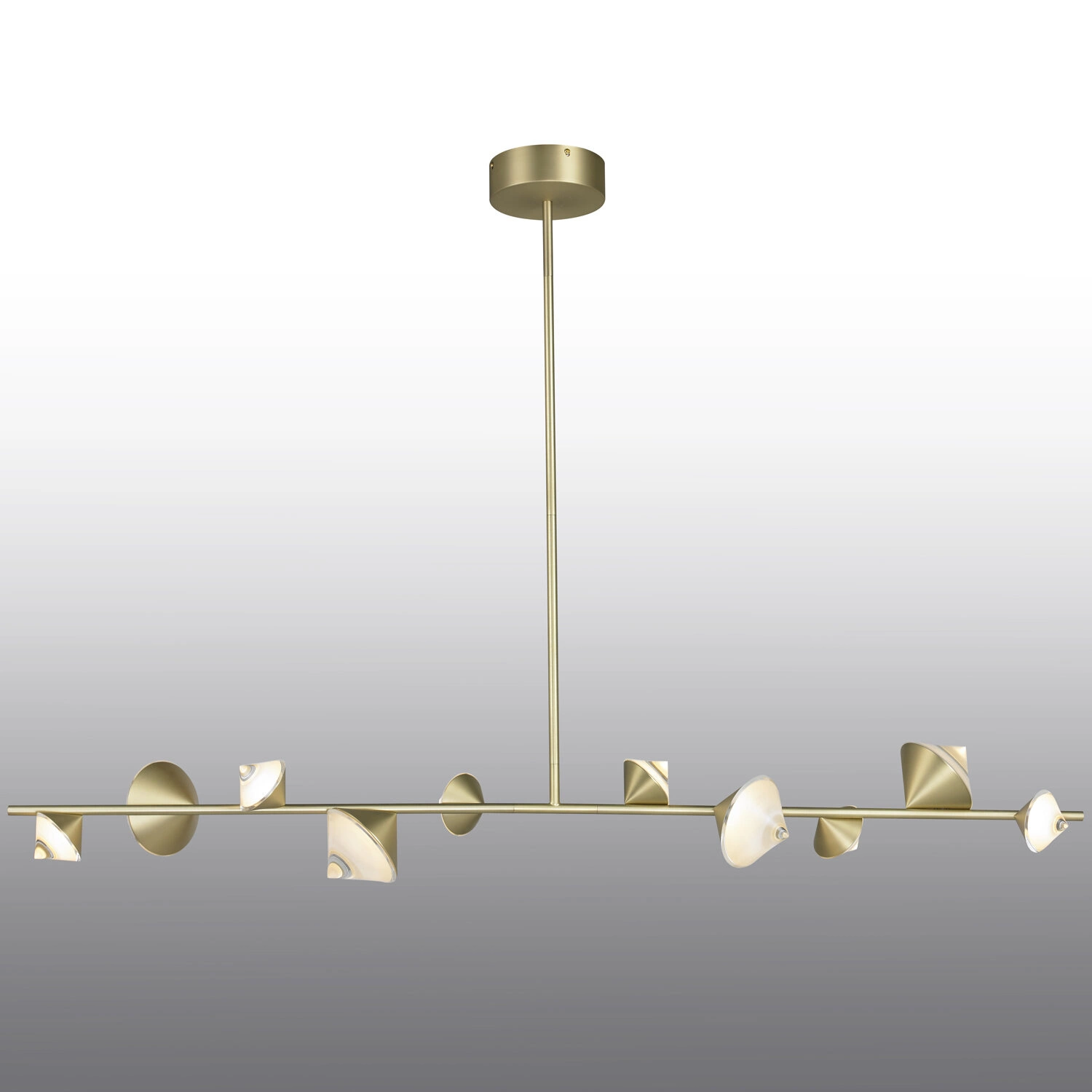 Moderní zlaté závěsné LED svítidlo CONE 130 cm od Step into Design je výjimečnou volbou pro milovníky elegantního a zároveň funkčního osvětlení. Vyrobeno z kovu, vybaveno 10 úspornými LED světelnými body o výkonu 33 W, poskytuje příjemné, teplé světlo. Díky působivé délce 130 cm a originálnímu tvaru je ideální jak do obývacího pokoje, nad jídelní stůl, tak jako závěsná lampa nad kuchyňský ostrůvek.