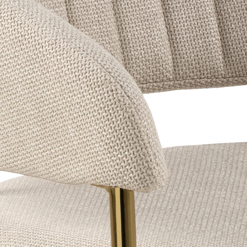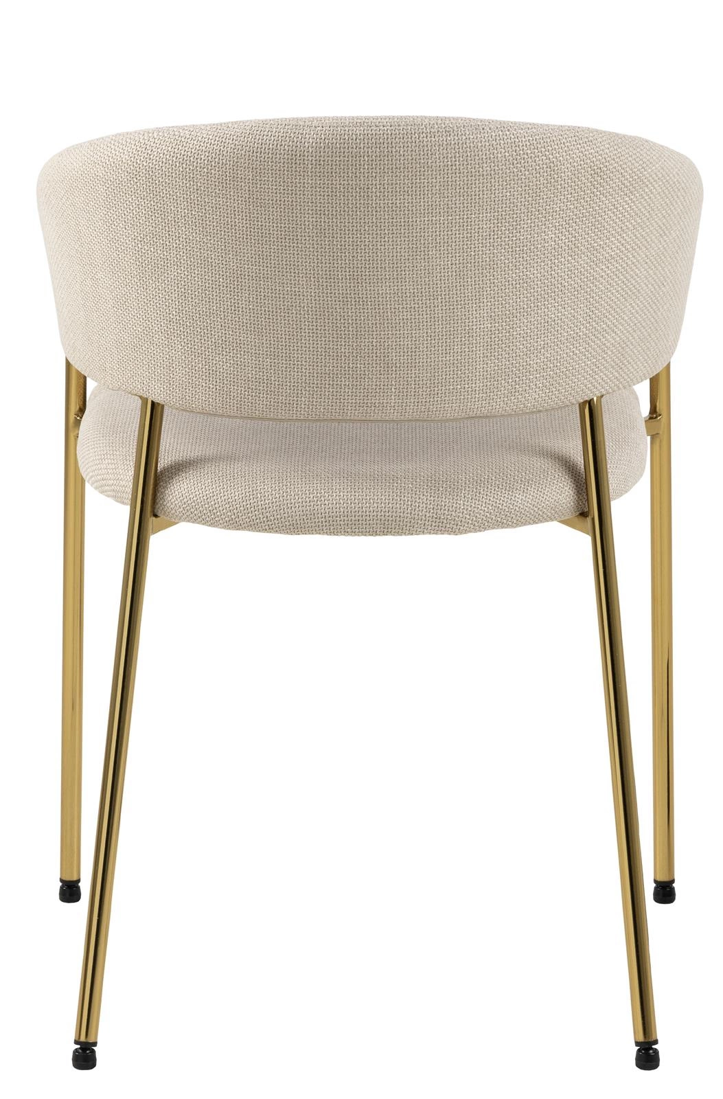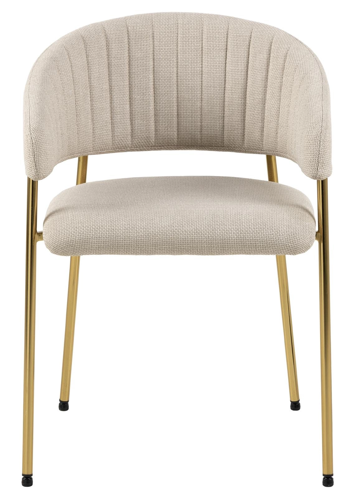 Béžové čalounění ve spojení s lesklými zlatými nohami dodává židli Ann sofistikovaný, moderní charakter, který skvěle zapadá do aktuálních interiérových trendů. Detaily jako jemné prošívání a štíhlé nohy podtrhují luxusní glamour styl a zajišťují, že tento nábytek vypadá dokonale jak u jídelního stolu, tak jako židle do obýváku nebo elegantní kuchyně. Kovová podnož zaručuje nejen atraktivní vzhled, ale také dlouhou životnost a stabilitu.