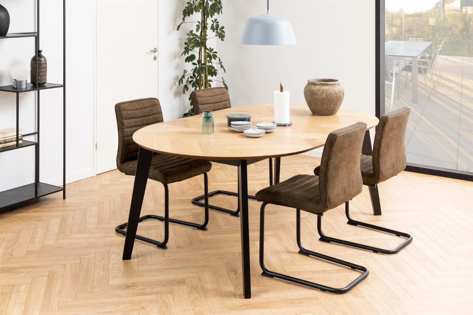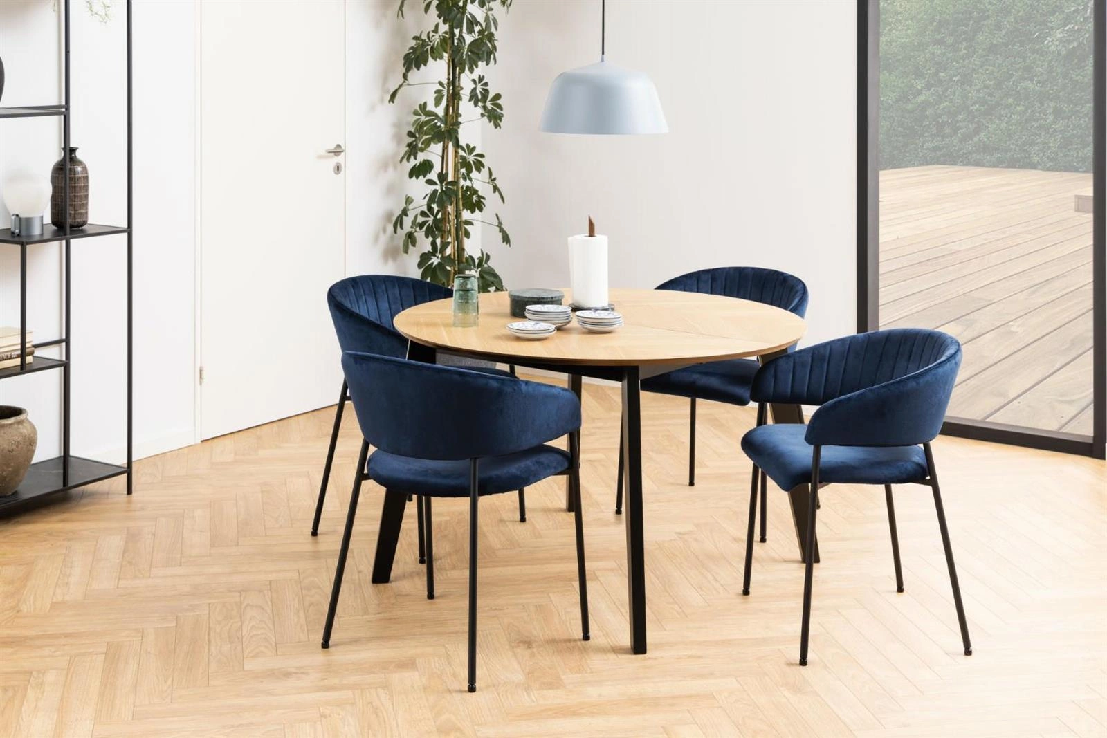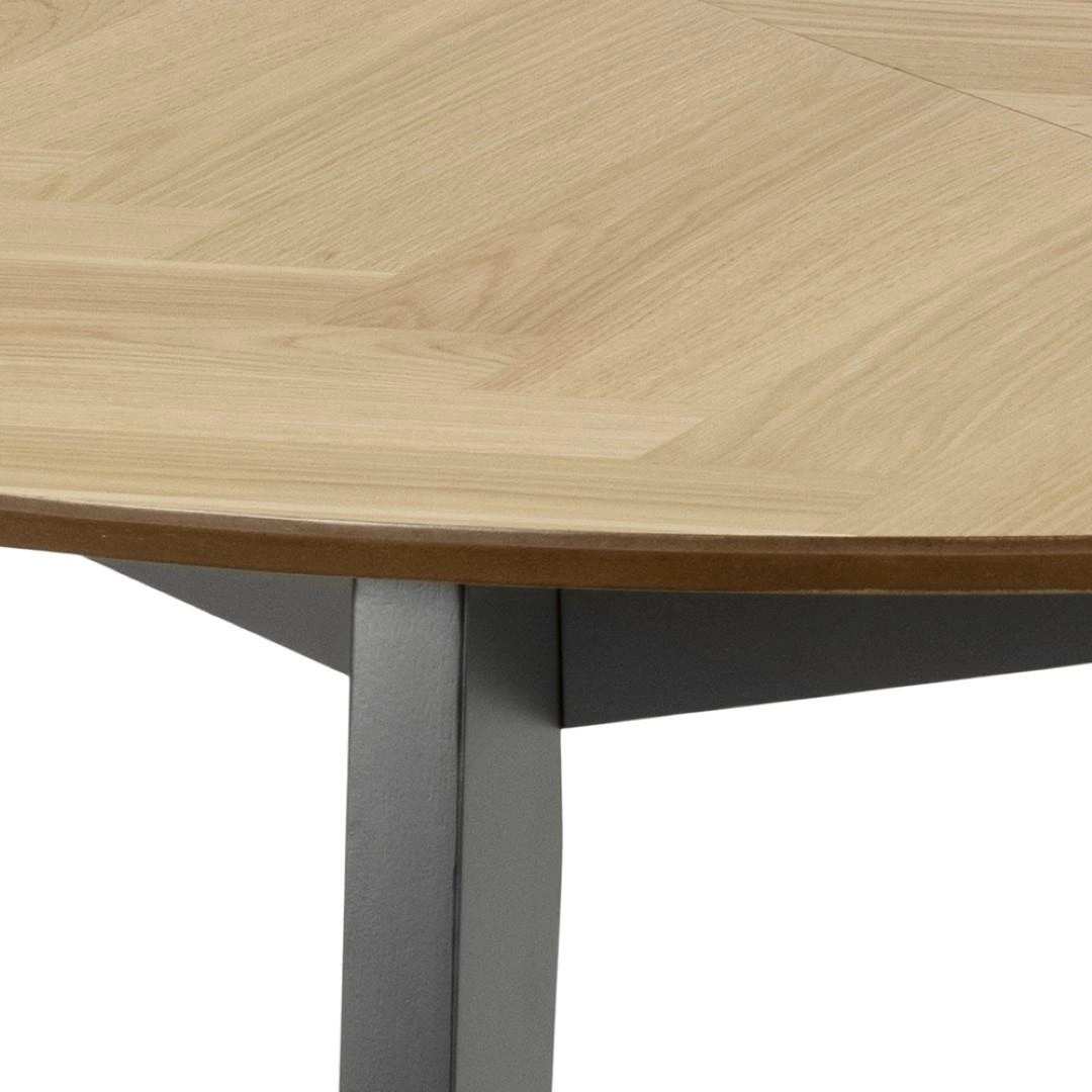 Stůl Georgetown má kulatou desku z dubové dýhy, která se vyznačuje rovnoměrnou, velkou kresbou a jednotnou barvou. A podnož tvořenou čtyřmi nohami z černého kaučukového dřeva. Povrch desky je pokrytý vzorem rybí kosti, který ze stolu dělá ještě zajímavější kus nábytku. Georgetown upoutá pozornost i těch nejnáročnějších znalců. Stůl je rozkládací, jeho desku lze rozložit na šířku 198 cm.